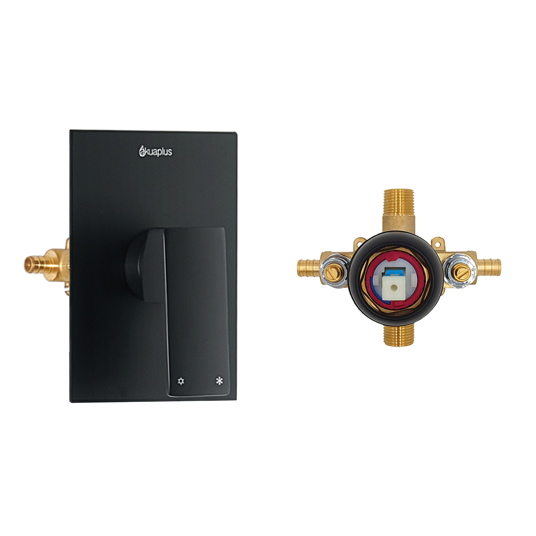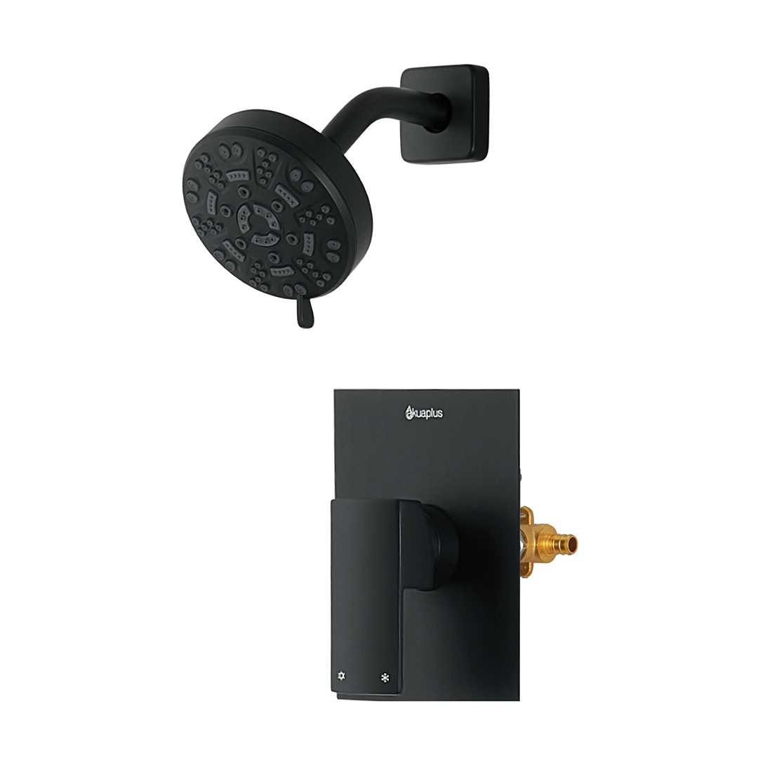 akuaplus® SHELA Shower Kit with pressure balance valve, 4 3/4-inch round 8-setting Showerhead, and 6-inch wall-mounted Shower arm in a matte black finish.
