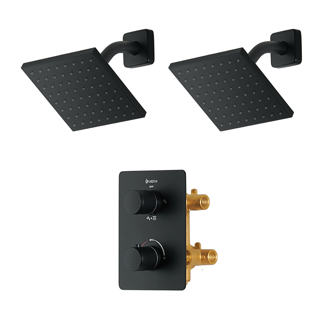 SQUARE THERMOSTATIC SHOWER SET: Valve made of brass with thermostatic cartridge; 4-way diverter (shower head, other shower head, both simultaneously or off); 6-inch (15.24 cm) square ABS swiveling shower head with easy-to-clean anti-limescale nozzles; Flow rate 9.5 L/min (2.5 US gal/min).