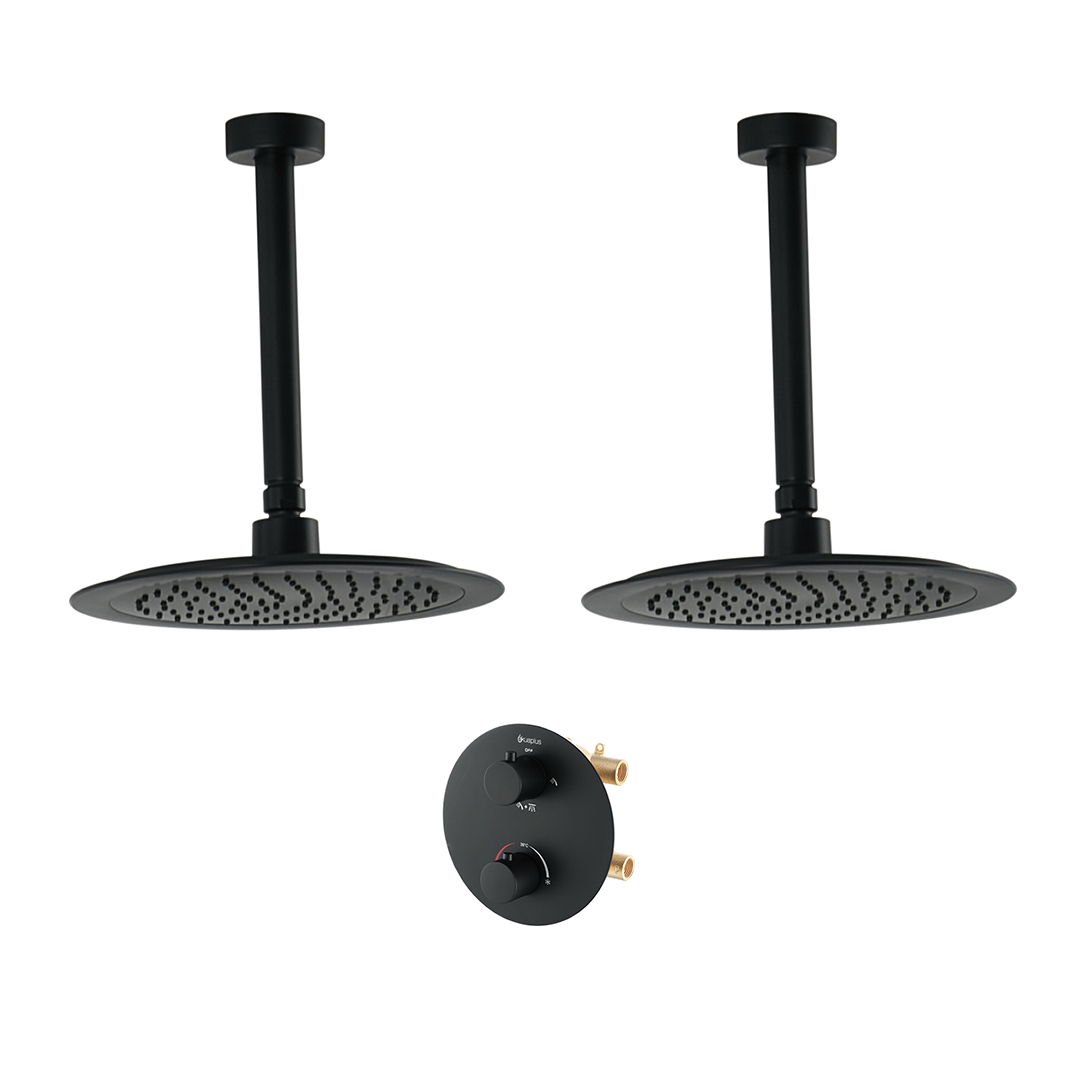 ROUND THERMOSTATIC SHOWER SET: Valve made of brass with thermostatic cartridge; 4-way diverter (shower head, other shower head, both simultaneously or off); 8-inch (20.3 cm) brass ceiling mount shower arms; 9-1/2 inch (24.13 cm) ABS shower heads, swivelling with brass ball joints; Easy-to-clean anti-limescale nozzles; Flow rate of 9.5 L/min (2.5 US gal/min).