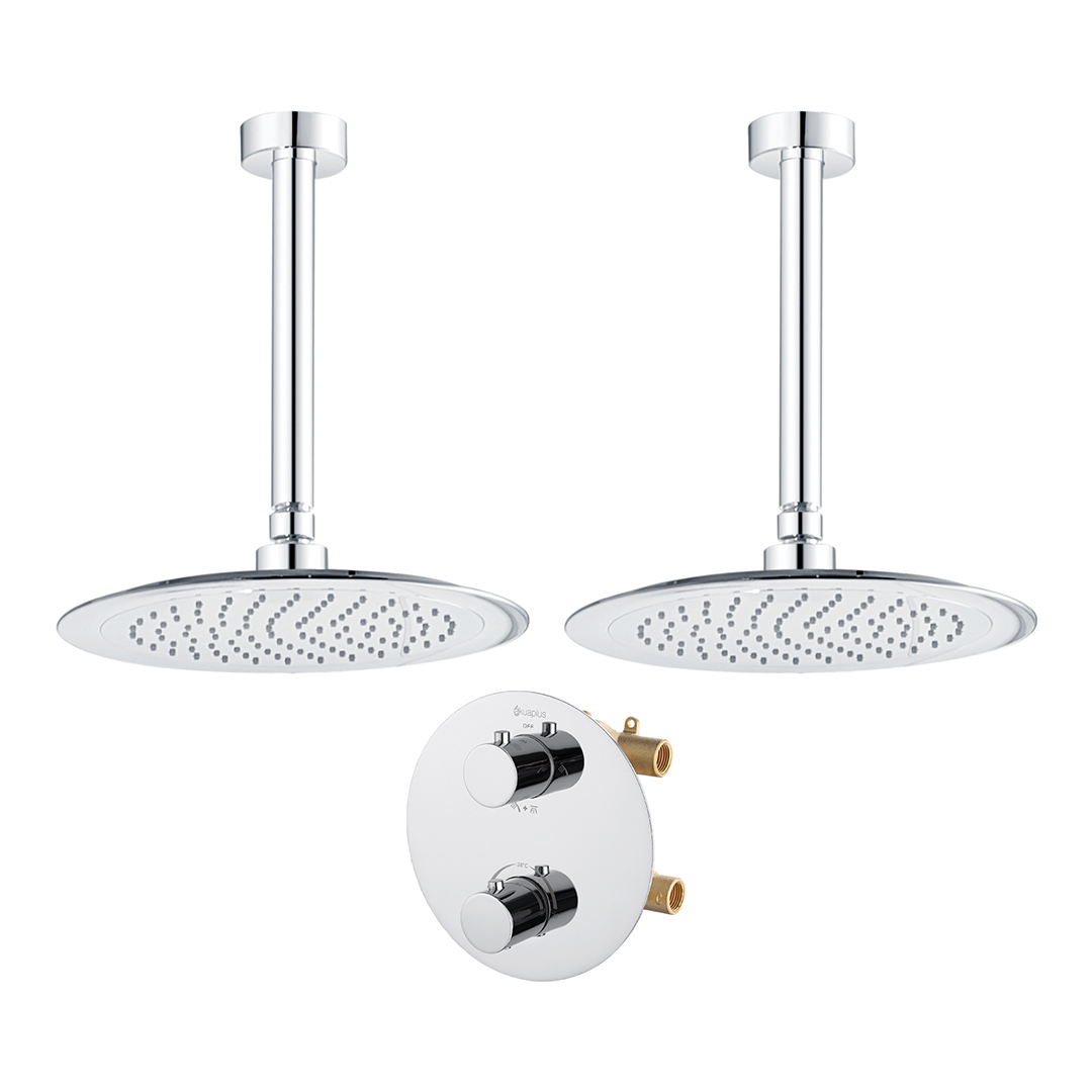 ROUND THERMOSTATIC SHOWER SET: Valve made of brass with thermostatic cartridge; 4-way diverter (shower head, other shower head, both simultaneously or off); 8-inch (20.3 cm) brass ceiling mount shower arms; 9-1/2 inch (24.13 cm) ABS shower heads, swivelling with brass ball joints; Easy-to-clean anti-limescale nozzles; Flow rate of 9.5 L/min (2.5 US gal/min).