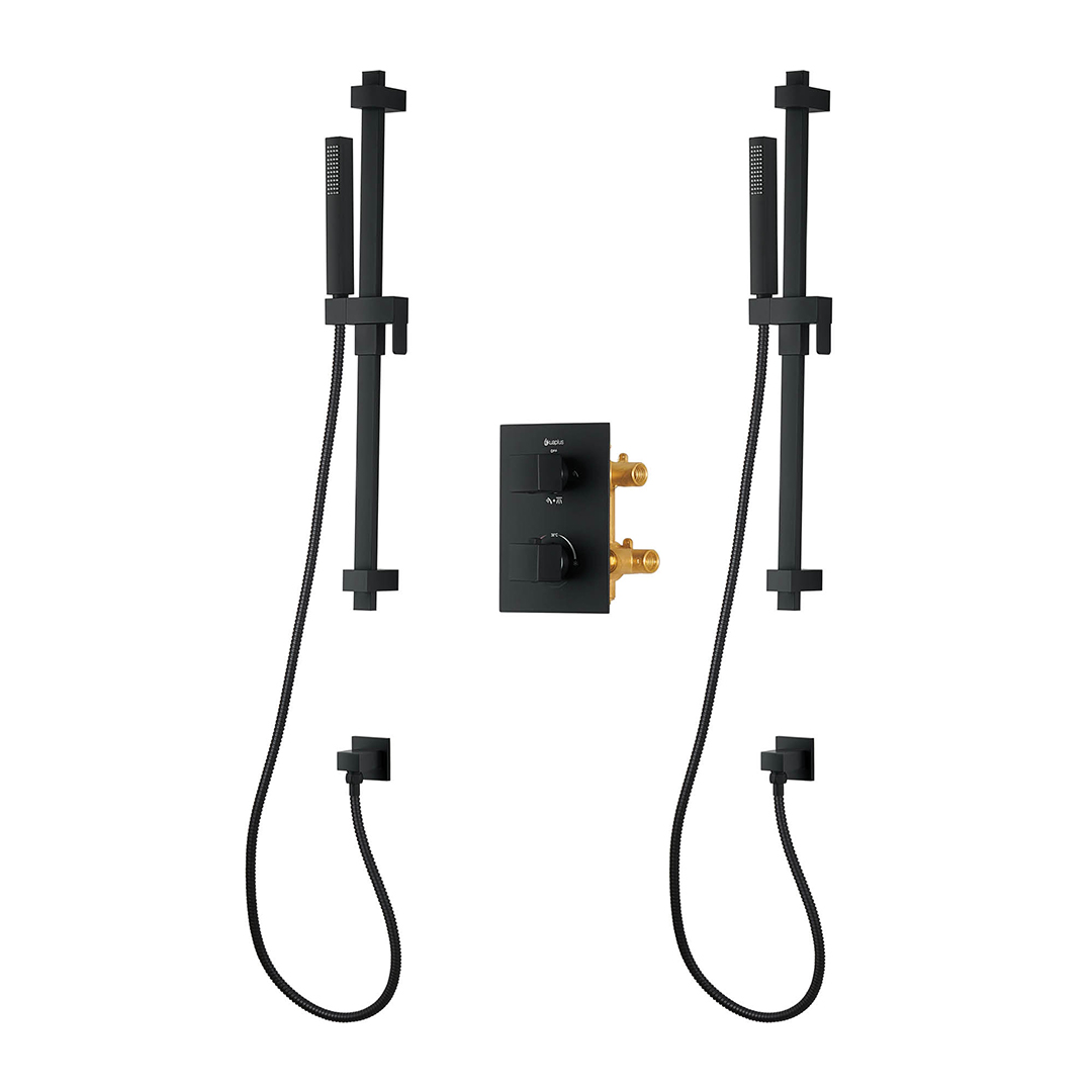 SQUARE THERMOSTATIC SHOWER SET: Valve made of brass with thermostatic cartridge; 4-way diverter (handheld shower, other handheld shower, both simultaneously or off); 31-1/2 inch (80 cm) stainless steel wall mount shower posts with adjustable ABS handheld shower brackets; 1-setting ABS handheld showers with easy-to-clean anti-limescale nozzles; Flexible 59-inch (1.5 m) double interlocking stainless steel hose with brass fittings; Brass elbow fittings; Flow rate of 9.5 L/min (2.5 US gal/min).