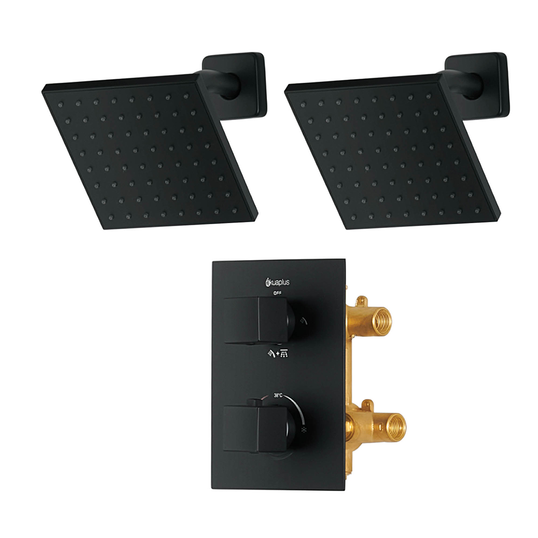 SQUARE THERMOSTATIC SHOWER SET: Valve made of brass with thermostatic cartridge; 4-way diverter (shower head, other shower head, both simultaneously or off); 6-inch (15.24 cm) brass wall mount shower arms; 6-inch (15.24 cm) square ABS swiveling shower head with easy-to-clean anti-limescale nozzles; Flow rate 9.5 L/min (2.5 US gal/min).
