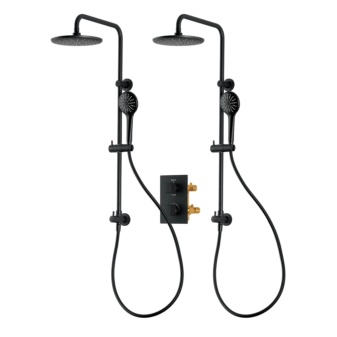 THERMOSTATIC SHOWER SET: Valve made of brass with thermostatic cartridge; 4-way diverter (shower system, other shower system, both simultaneously or off); Shower systems on brass shower posts with adjustable shower brackets; 3-way diverters (shower head, handheld shower, or both simultaneously); 8-5/8 inches (22 cm) swiveling shower heads; 3-setting handheld showers; Easy-to-clean anti-limescale nozzles; Flexible 59-inch (1.5 m) PVC hoses with brass fittings; Flow rate of 9.5 L/min (2.5 US gal/min).