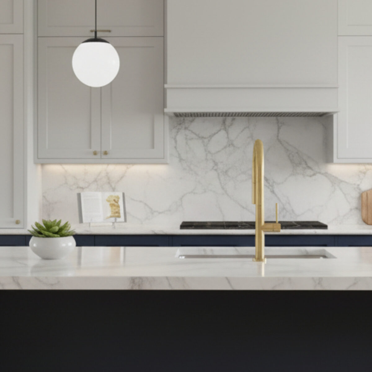 Single-hole kitchen faucet with pull-down sprayer in brushed champagne gold finish, ceramic cartridge, 360° swivel spout.