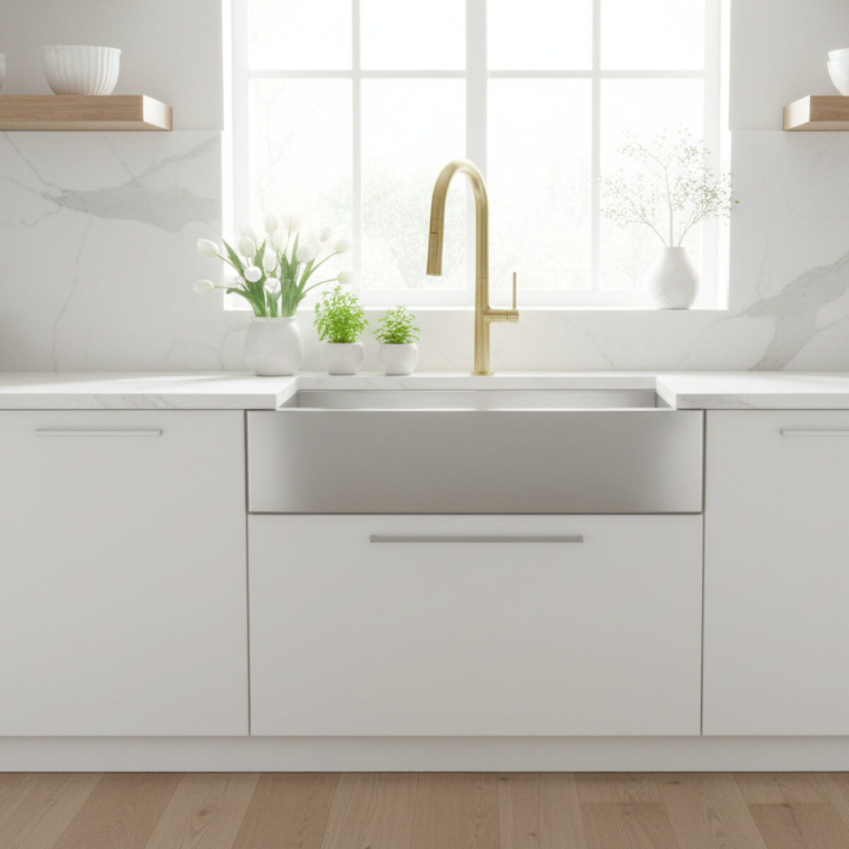 Single-hole kitchen faucet featuring a 2-function pull-down sprayer with smooth retraction. The spout swivels 360° for flexible use. Equipped with easy-to-clean anti-limescale nozzles, a ceramic cartridge and a single lever for water flow and temperature control. Includes a nylon braided hose and is designed for easy installation. Flow rate is 6.81 L/min (1.8 US gpm). The 3-hole sink cover plate is sold separately.
