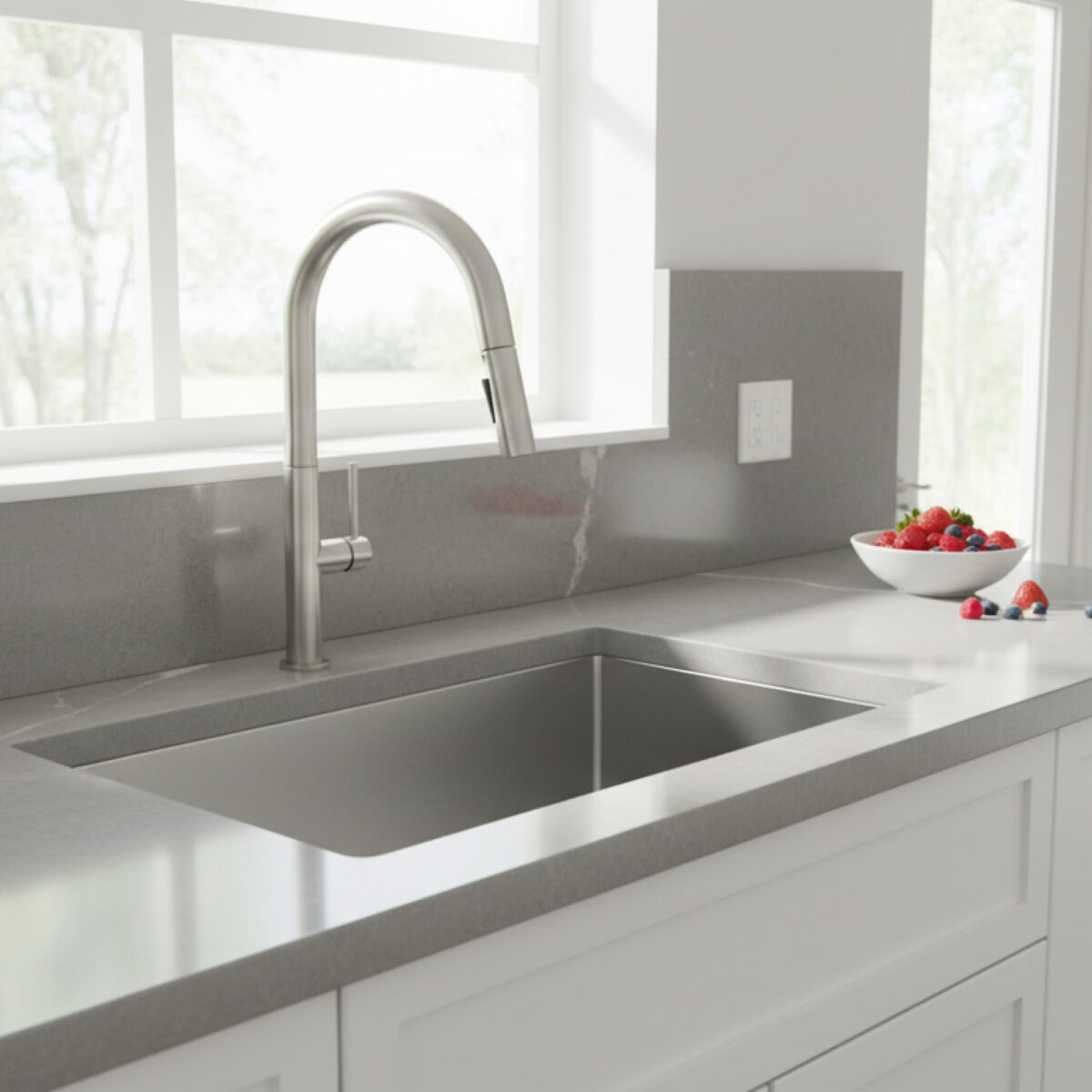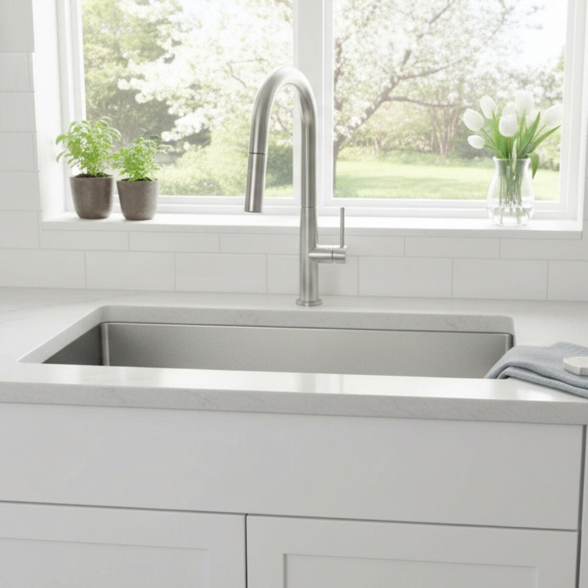 Single-hole kitchen faucet featuring a 2-function pull-down sprayer with smooth retraction. The spout swivels 360° for flexible use. Equipped with easy-to-clean anti-limescale nozzles, a ceramic cartridge and a single lever for water flow and temperature control. Includes a nylon braided hose and is designed for easy installation. Flow rate is 6.81 L/min (1.8 US gpm). The 3-hole sink cover plate is sold separately.