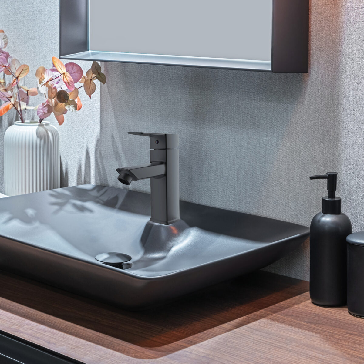 Single-hole bathroom faucet in a matte black finish.