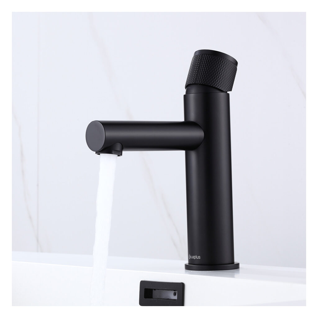 Round single-hole bathroom faucet made of brass in a matte black finish.