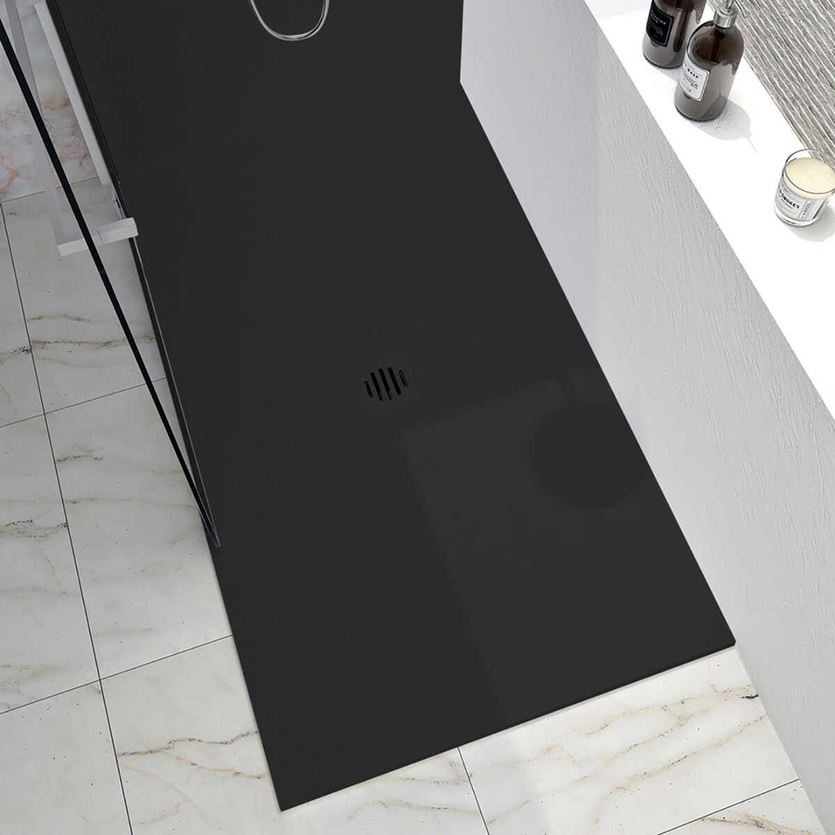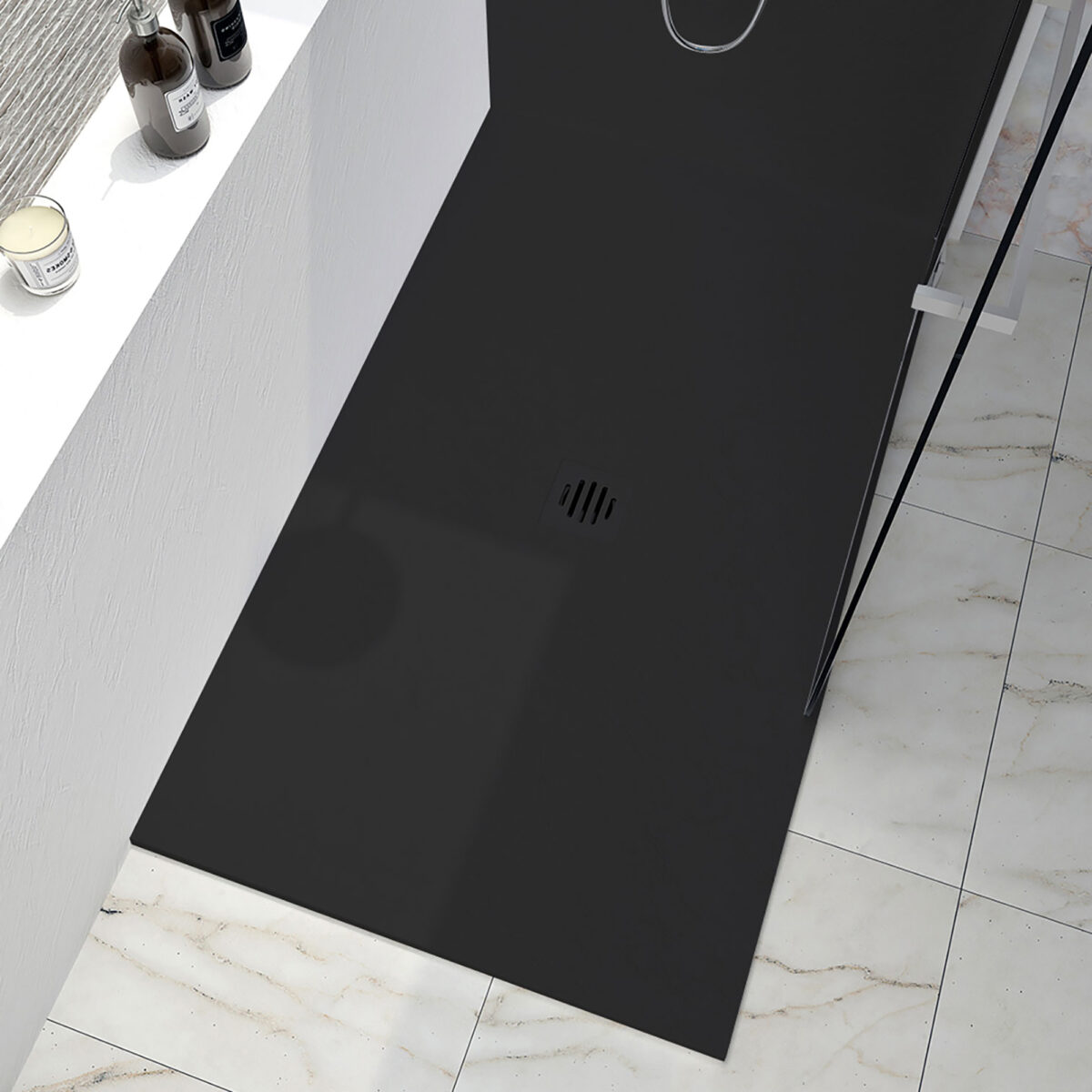 The SLATE shower base is designed to offer a modern and versatile solution for residential installations. Made of high-pressure molded resin (stone dust), it ensures excellent durability, high resistance, and easy maintenance. Its textured finish provides a contemporary and elegant look. The base features a central drain with an integrated decorative drain cover, ensuring a clean finish and efficient drainage. It allows for several installation configurations depending on the project: in an alcove, in a corner with a wall on the right, in a corner with a wall on the left, or with a wall at the back. The base can be cut to the desired dimensions to precisely fit the bathroom layout. The tile flange is not installed. Flange installation is available separately. Designed for residential installation, the SLATE shower base combines installation flexibility, robustness, and contemporary design. Zitta Collection. Dimensions: 36 in × 36 in × 2 1/2 in (914 × 914 × 64 mm)