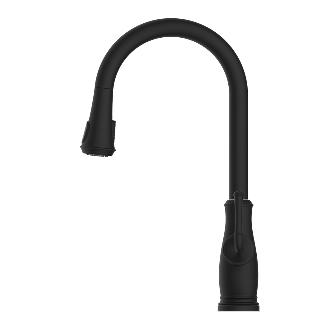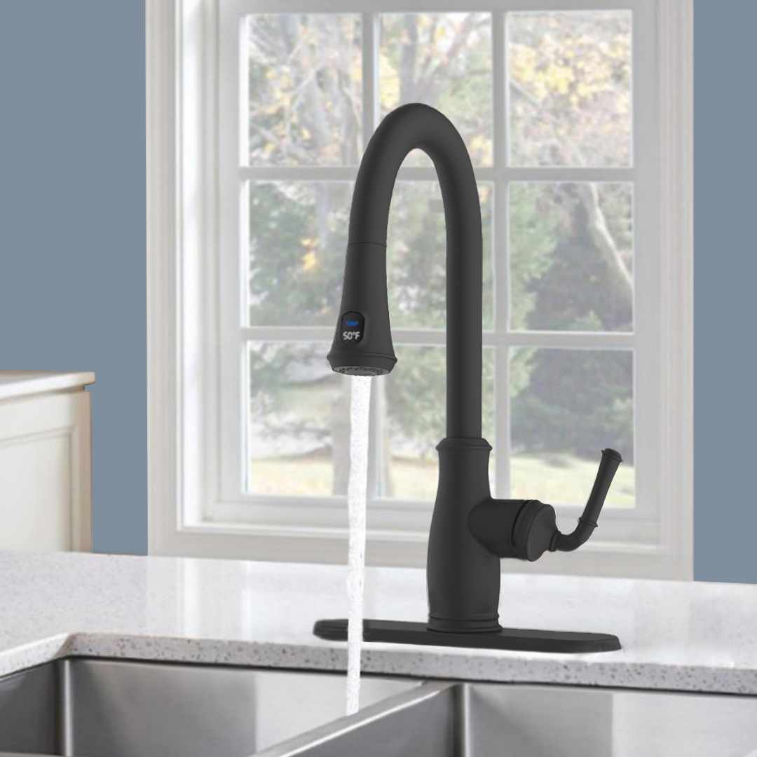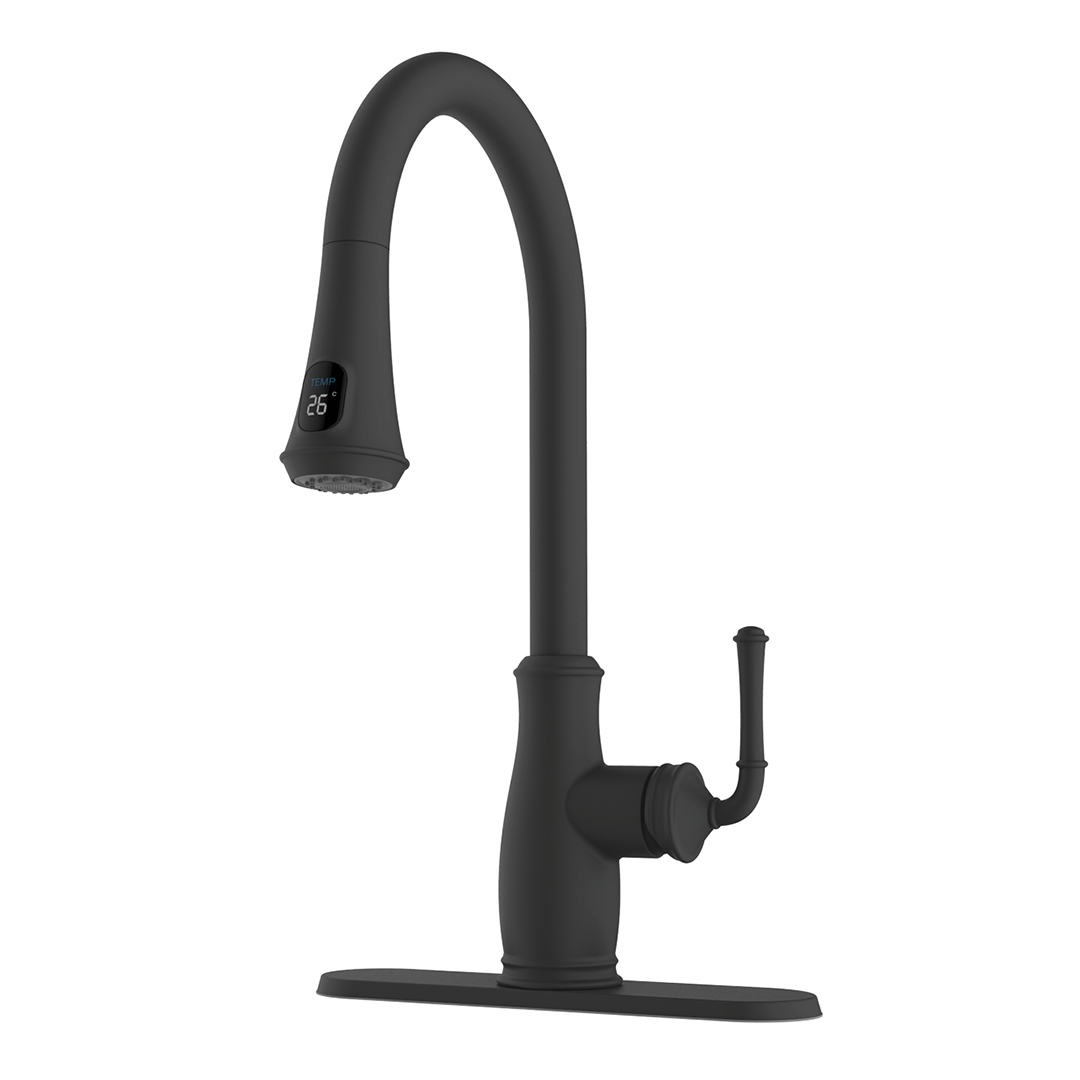 Pull-Down Kitchen Faucet in a matte black finish with temperature Digital Display.
