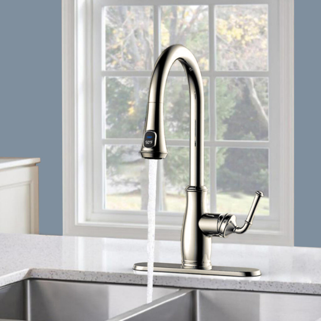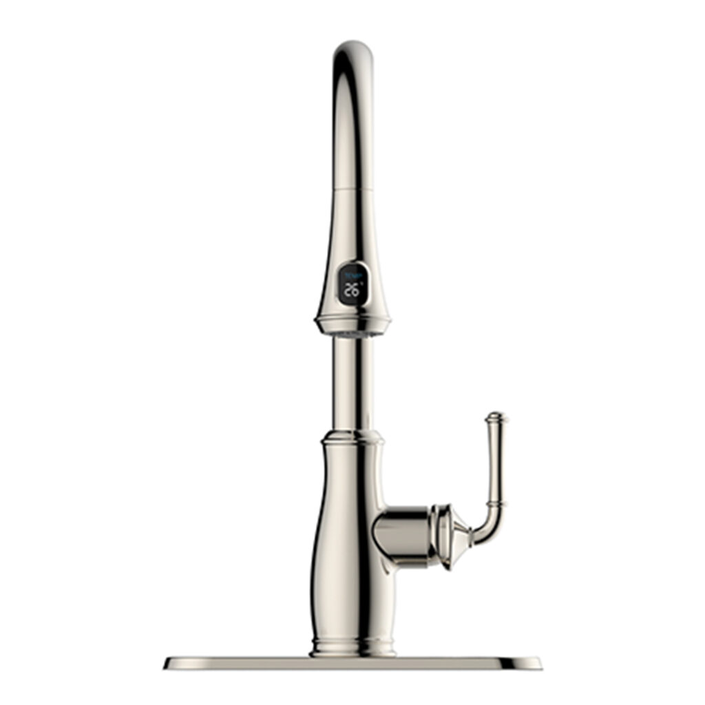 SINGLE-HOLE KITCHEN FAUCET: 2-way pulldown sprayer with smooth retraction and digital temperature display; 360° adjustable swivel spout; Easy-to-clean anti-limescale nozzles; Ceramic cartridge; Single lever for water volume and temperature control; Nylon braided hose; Flow of 6.81 L/min (1.8 US gal/min); Easy installation; Cover plate included.