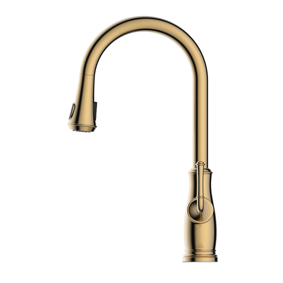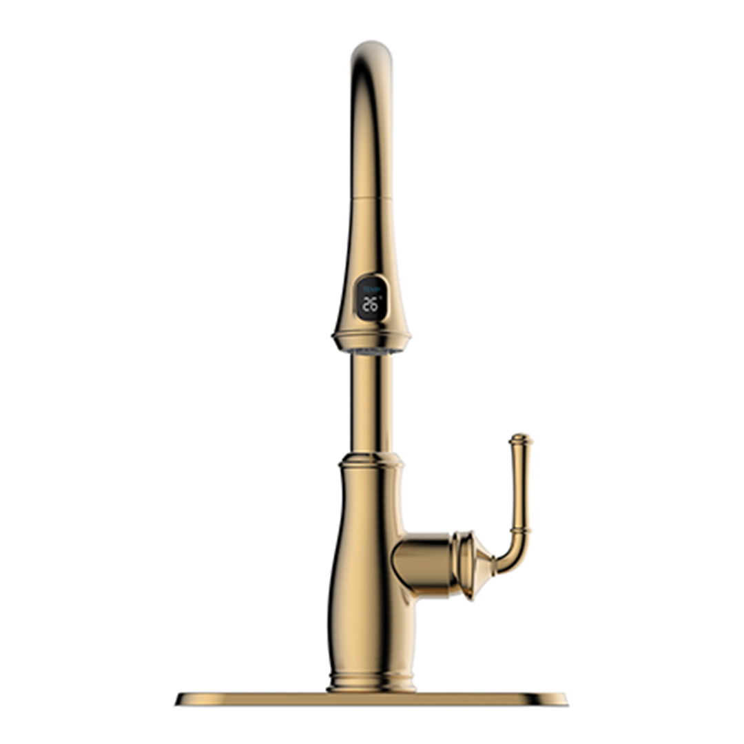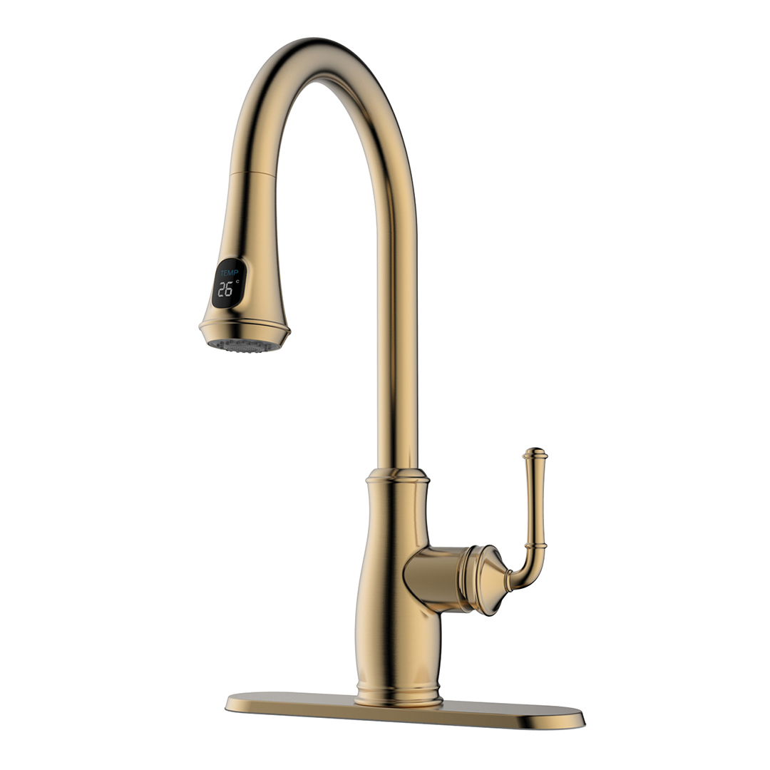 Pull-Down Kitchen Faucet in a champagne gold finish with temperature Digital Display.