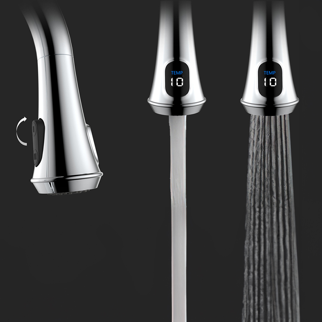 SINGLE-HOLE KITCHEN FAUCET: 2-way pulldown sprayer with smooth retraction and digital temperature display; 360° adjustable swivel spout; Easy-to-clean anti-limescale nozzles; Ceramic cartridge; Single lever for water volume and temperature control; Nylon braided hose; Flow of 6.81 L/min (1.8 US gal/min); Easy installation; Cover plate included.