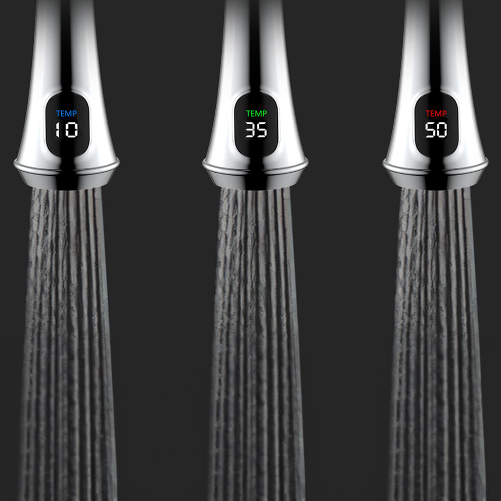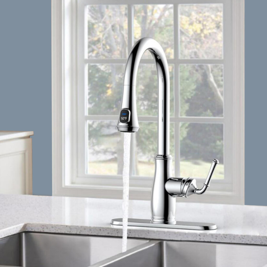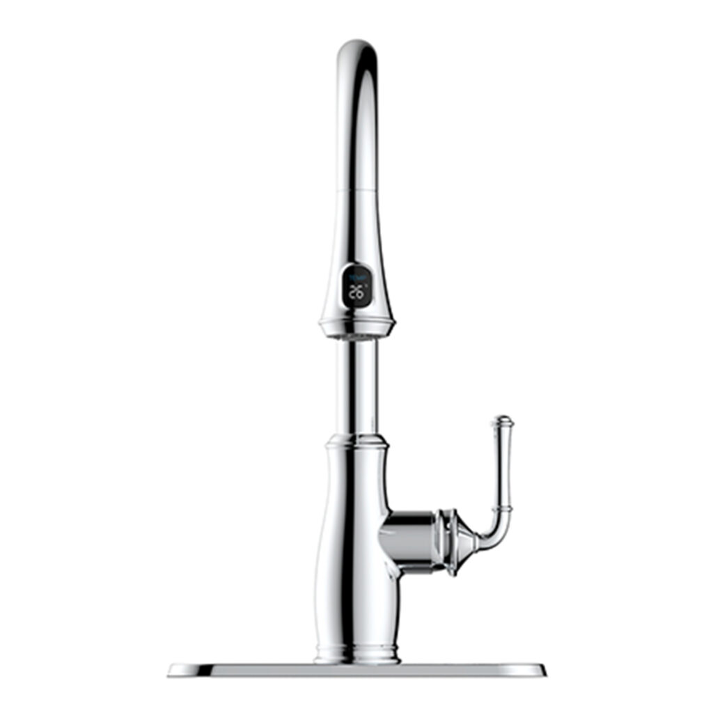 SINGLE-HOLE KITCHEN FAUCET: 2-way pulldown sprayer with smooth retraction and digital temperature display; 360° adjustable swivel spout; Easy-to-clean anti-limescale nozzles; Ceramic cartridge; Single lever for water volume and temperature control; Nylon braided hose; Flow of 6.81 L/min (1.8 US gal/min); Easy installation; Cover plate included.
