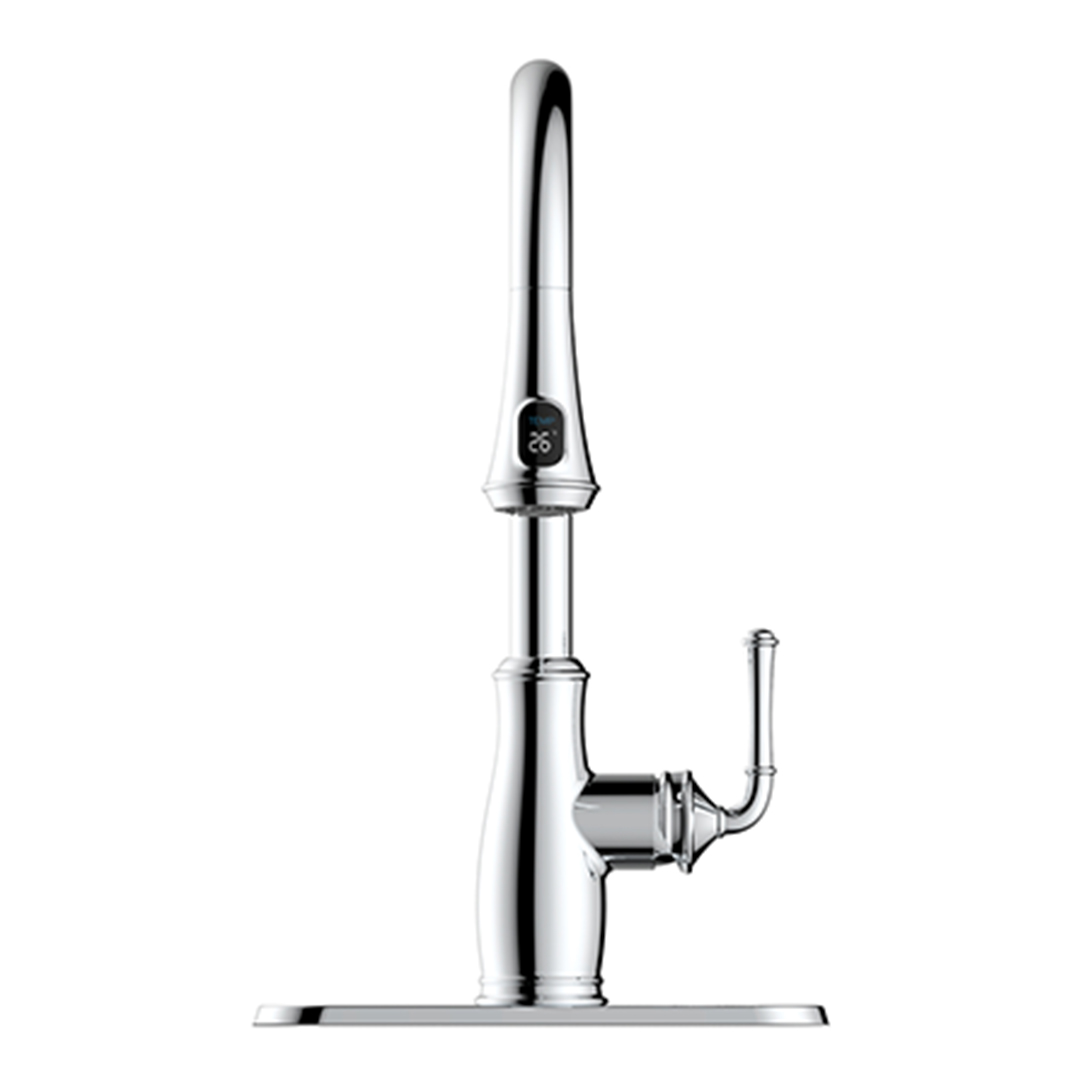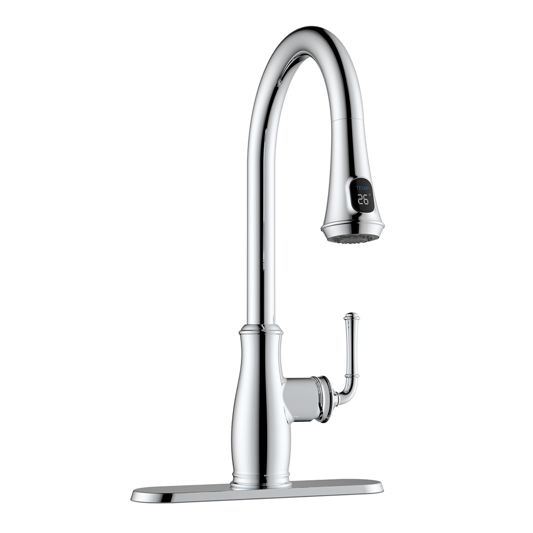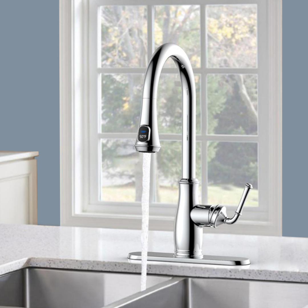 Pull-Down Kitchen Faucet in a chrome finish with temperature Digital Display.