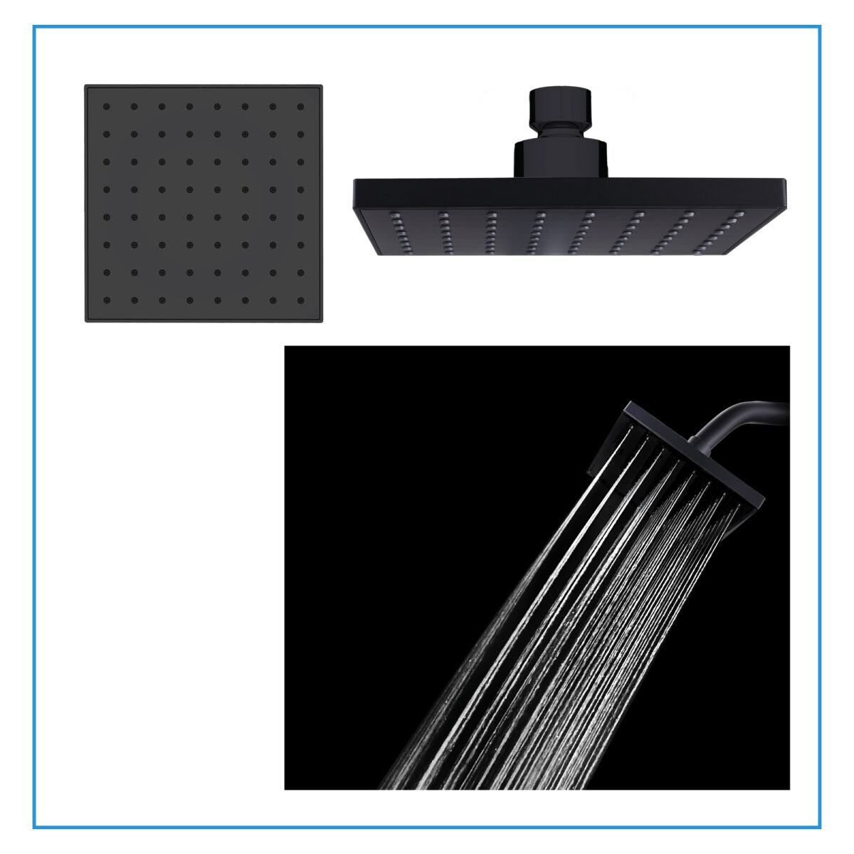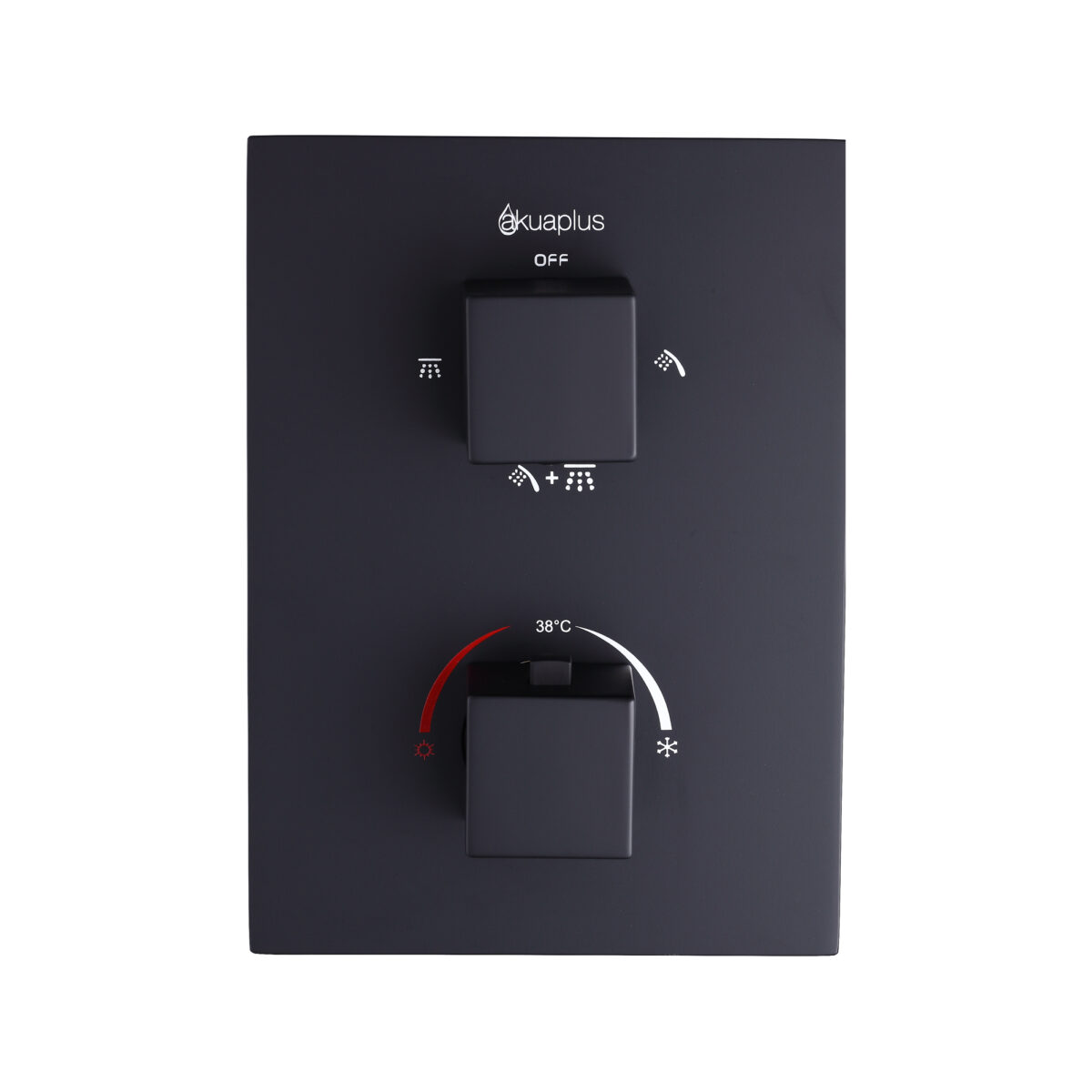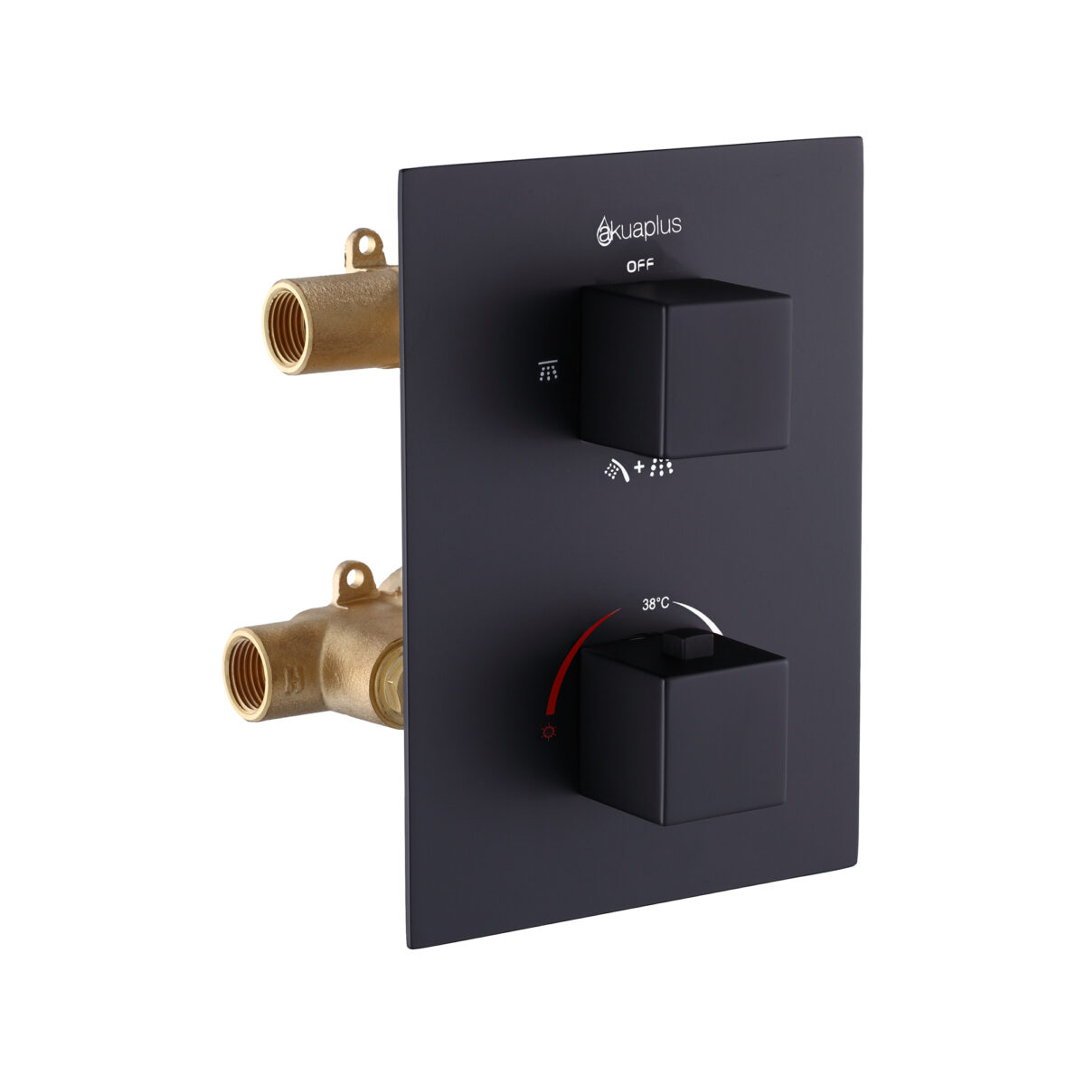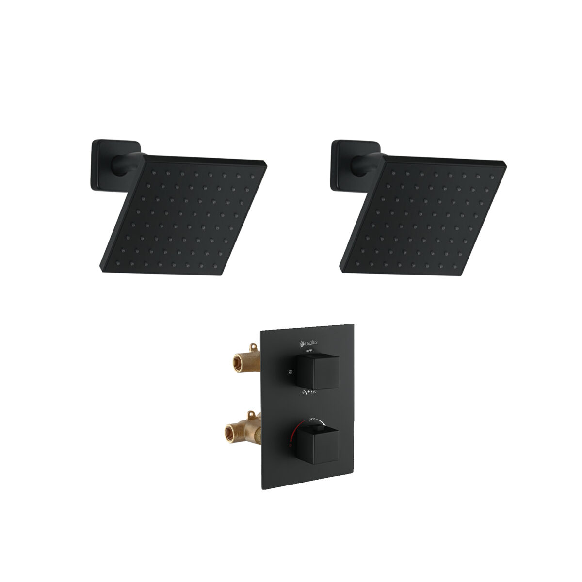 The square 4-way thermostatic duo shower set with two waterfall showerheads by akuaplus® is designed to provide a modern and high-performance solution for residential bathrooms. It includes a solid brass valve equipped with a thermostatic cartridge that maintains consistent and safe water temperature, along with an integrated shut-off valve for easier servicing. The 4-way diverter allows operation of one showerhead, the other showerhead, both simultaneously, or complete shut-off. The 1/2” threaded female connections ensure compatibility with standard North American plumbing systems. Each set includes a 6” (15.24 cm) brass shower arm with wall flange and a 6” (15.24 cm) square ABS waterfall showerhead that swivels and features easy-to-clean anti-limescale nozzles. The system delivers a controlled flow rate of 9.5 L/min (2.5 US gal/min), combining comfort and efficiency. This set is cUPC certified, ensuring compliance with North American plumbing standards.