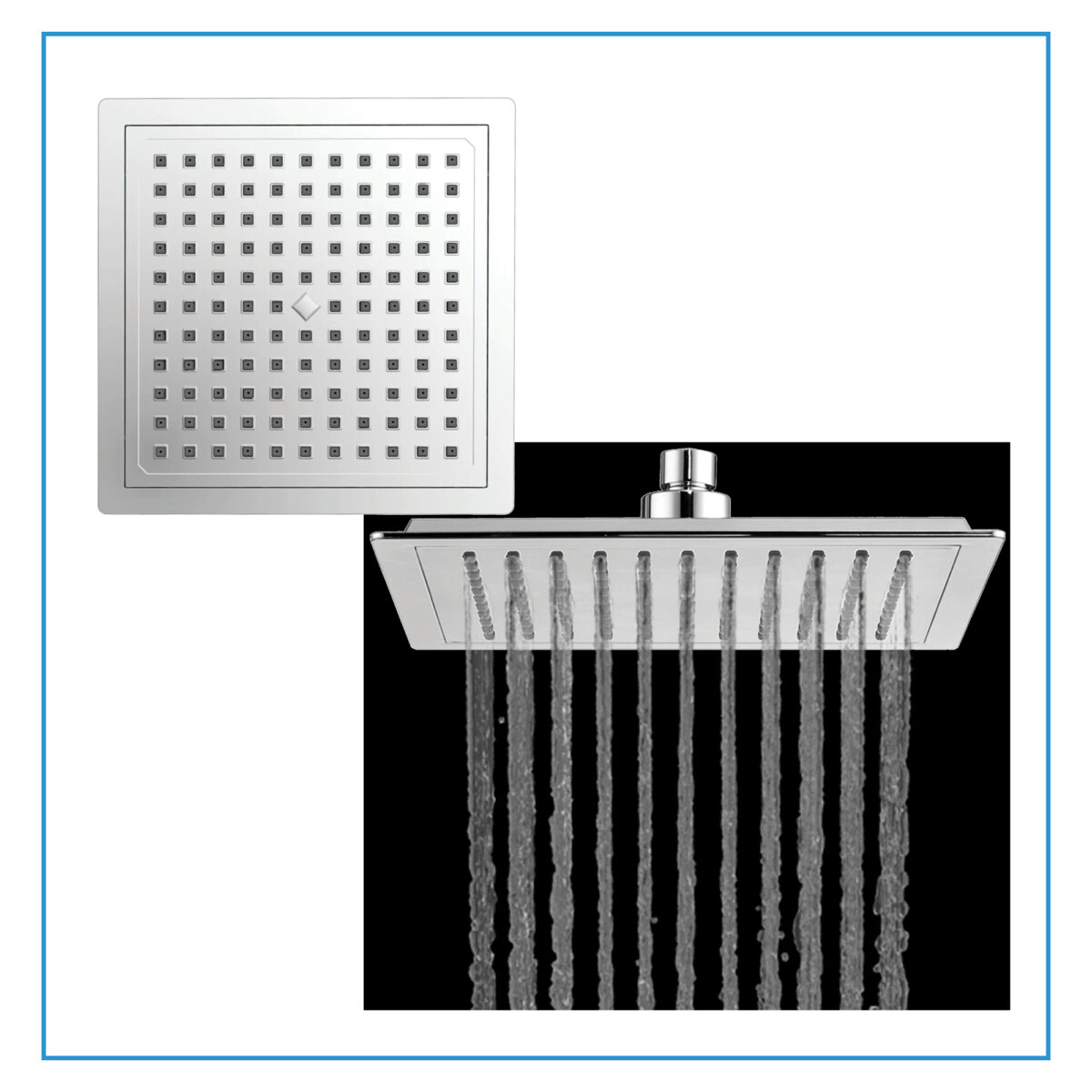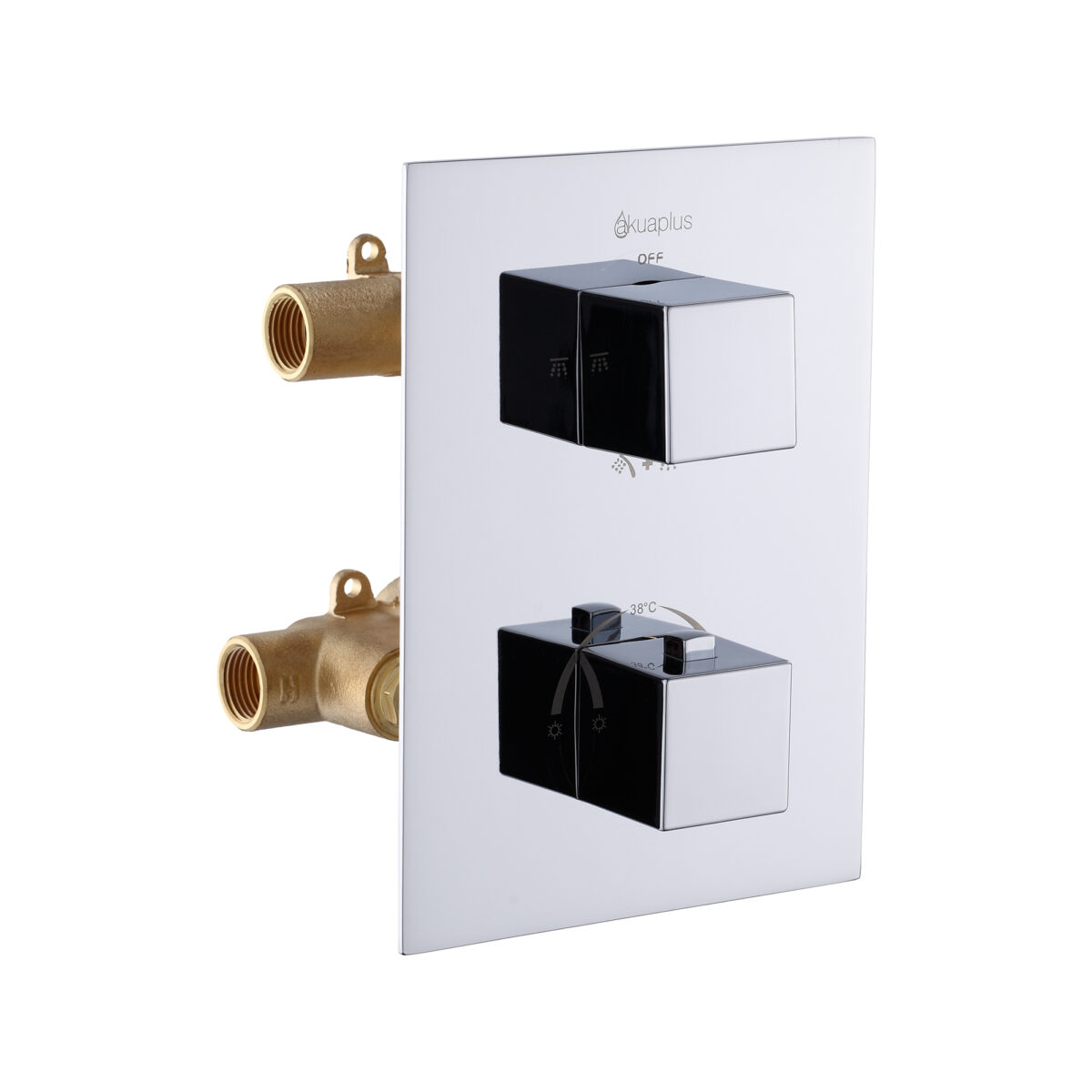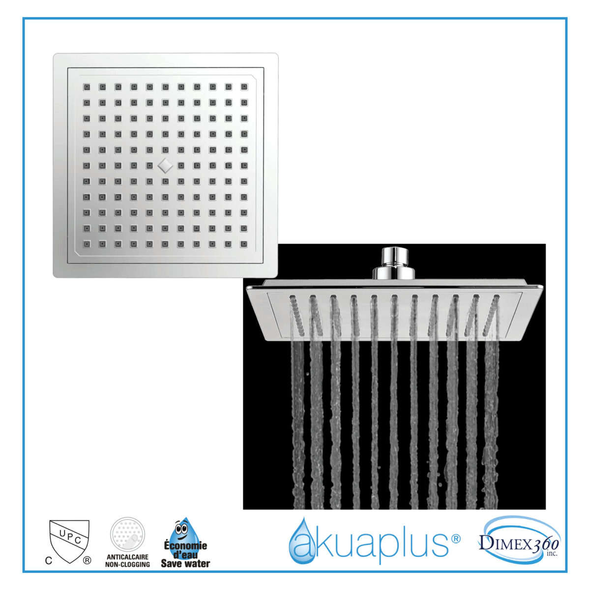 The square 4-way thermostatic duo shower set with two waterfall showerheads by akuaplus® is designed to provide an immersive and high-performance shower experience for modern residential bathrooms. It includes a solid brass valve equipped with a thermostatic cartridge that maintains consistent and safe water temperature, along with an integrated shut-off valve for easier servicing. The 4-way diverter allows operation of one showerhead, the other showerhead, both simultaneously, or complete shut-off. The 1/2” threaded female connections ensure compatibility with standard North American plumbing systems. Each set includes an 8” (20.3 cm) ceiling-mounted brass shower arm with flange and a 9” (22.86 cm) square ABS waterfall showerhead that swivels on a brass ball joint and features easy-to-clean anti-limescale nozzles. The system delivers a controlled flow rate of 9.5 L/min (2.5 US gal/min), combining comfort and efficiency. This set is cUPC certified, ensuring compliance with North American plumbing standards.