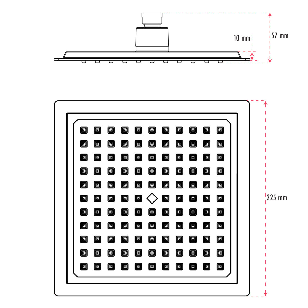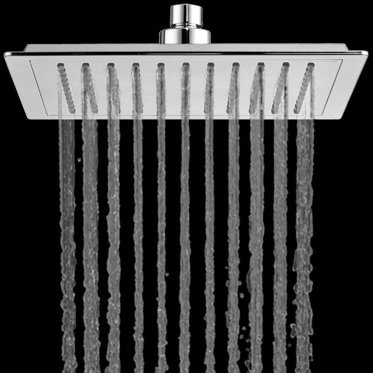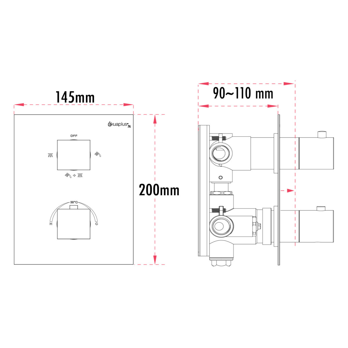 The square 4-way thermostatic duo shower set with two waterfall showerheads by akuaplus® is designed to provide an immersive and high-performance shower experience for modern residential bathrooms. It includes a solid brass valve equipped with a thermostatic cartridge that maintains consistent and safe water temperature, along with an integrated shut-off valve for easier servicing. The 4-way diverter allows operation of one showerhead, the other showerhead, both simultaneously, or complete shut-off. The 1/2” threaded female connections ensure compatibility with standard North American plumbing systems. Each set includes an 8” (20.3 cm) ceiling-mounted brass shower arm with flange and a 9” (22.86 cm) square ABS waterfall showerhead that swivels on a brass ball joint and features easy-to-clean anti-limescale nozzles. The system delivers a controlled flow rate of 9.5 L/min (2.5 US gal/min), combining comfort and efficiency. This set is cUPC certified, ensuring compliance with North American plumbing standards.