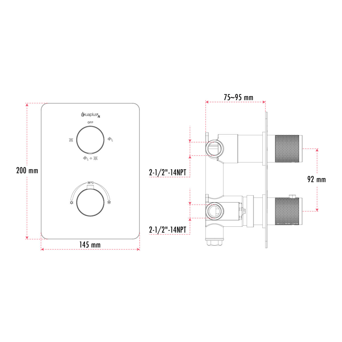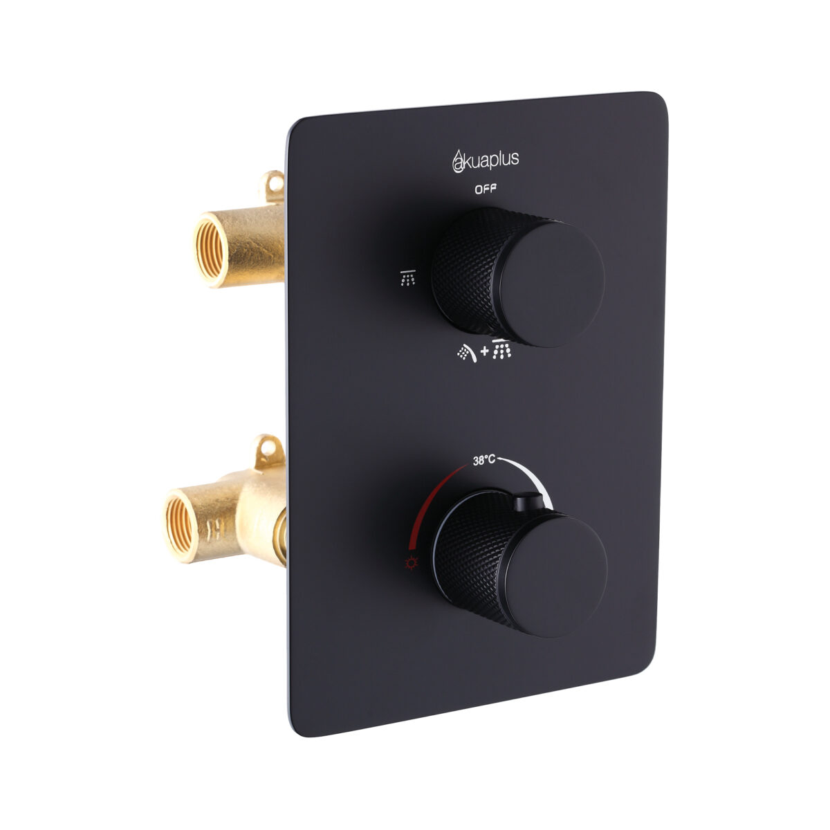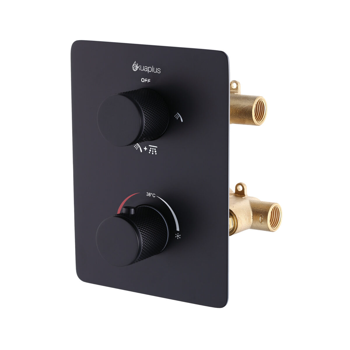 The square 4-way thermostatic shower set with waterfall showerhead and hand shower on shower rail by akuaplus® is designed to deliver precise temperature control and a complete shower experience for modern residential bathrooms. The solid brass valve features a thermostatic cartridge that maintains consistent and safe water temperature, along with an integrated shut-off valve for easier servicing. The 4-way diverter allows operation of the waterfall showerhead, hand shower, both simultaneously, or complete shut-off. The 1/2" threaded female connections ensure compatibility with standard North American plumbing systems. The system includes a 15 3/4" (40 cm) wall-mounted brass shower arm with flange and a 9" (22.86 cm) square ABS waterfall showerhead that swivels on a brass ball joint. The stainless steel shower rail measures 29 3/4" (75.5 cm) and features an adjustable ABS hand shower bracket. The 1-setting ABS hand shower includes easy-to-clean anti-limescale nozzles and delivers a controlled flow rate of 9.5 L/min (2.5 US gal/min). The set also includes a 59" (1.5 m) double interlocking stainless steel hose with brass fittings and a brass elbow fitting (male/male, 1/2"), ensuring durability and reliability. This set is cUPC certified, ensuring compliance with North American plumbing standards.