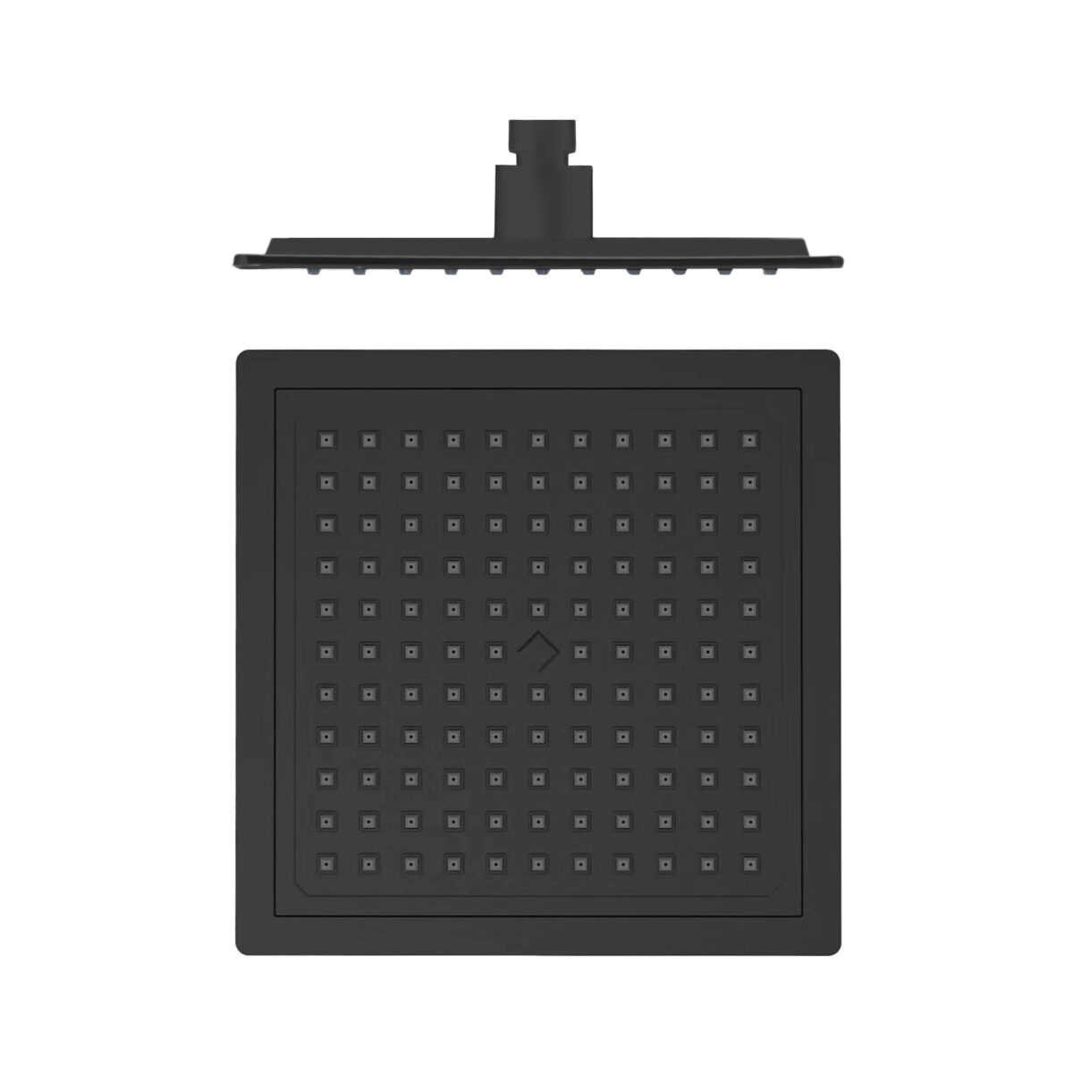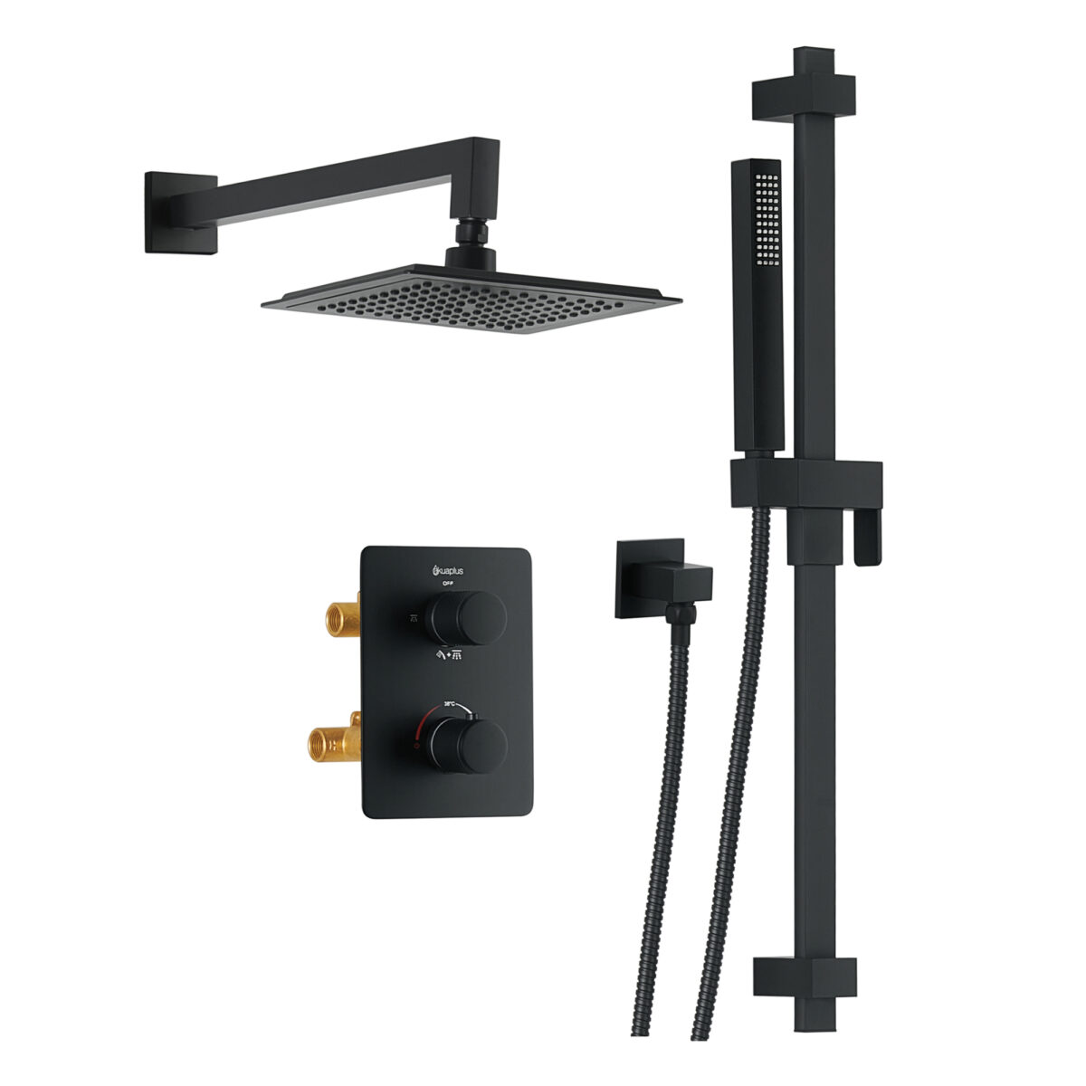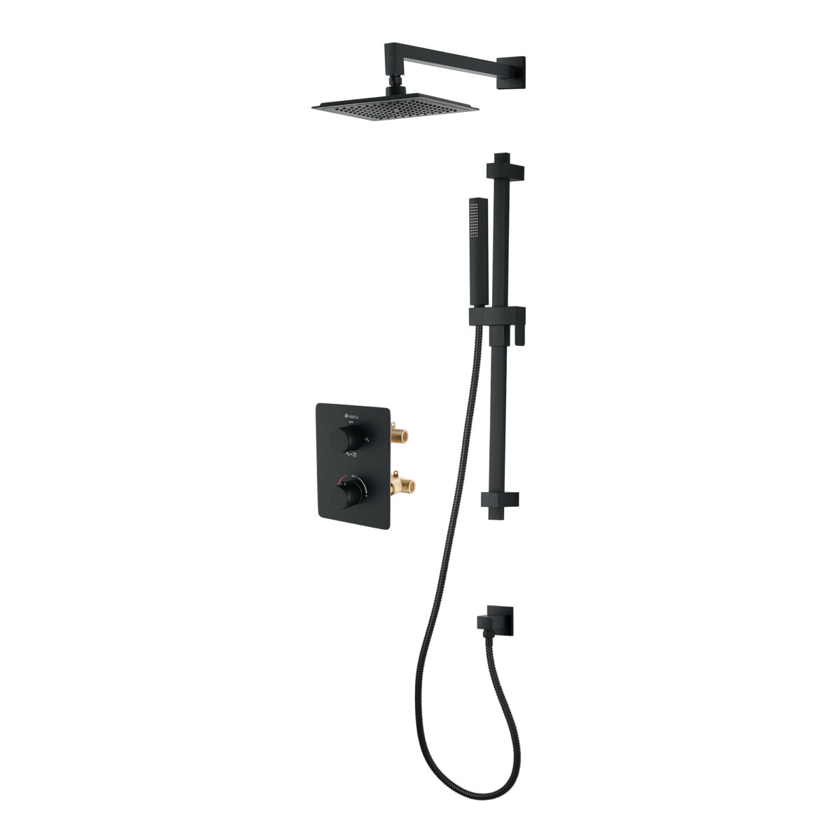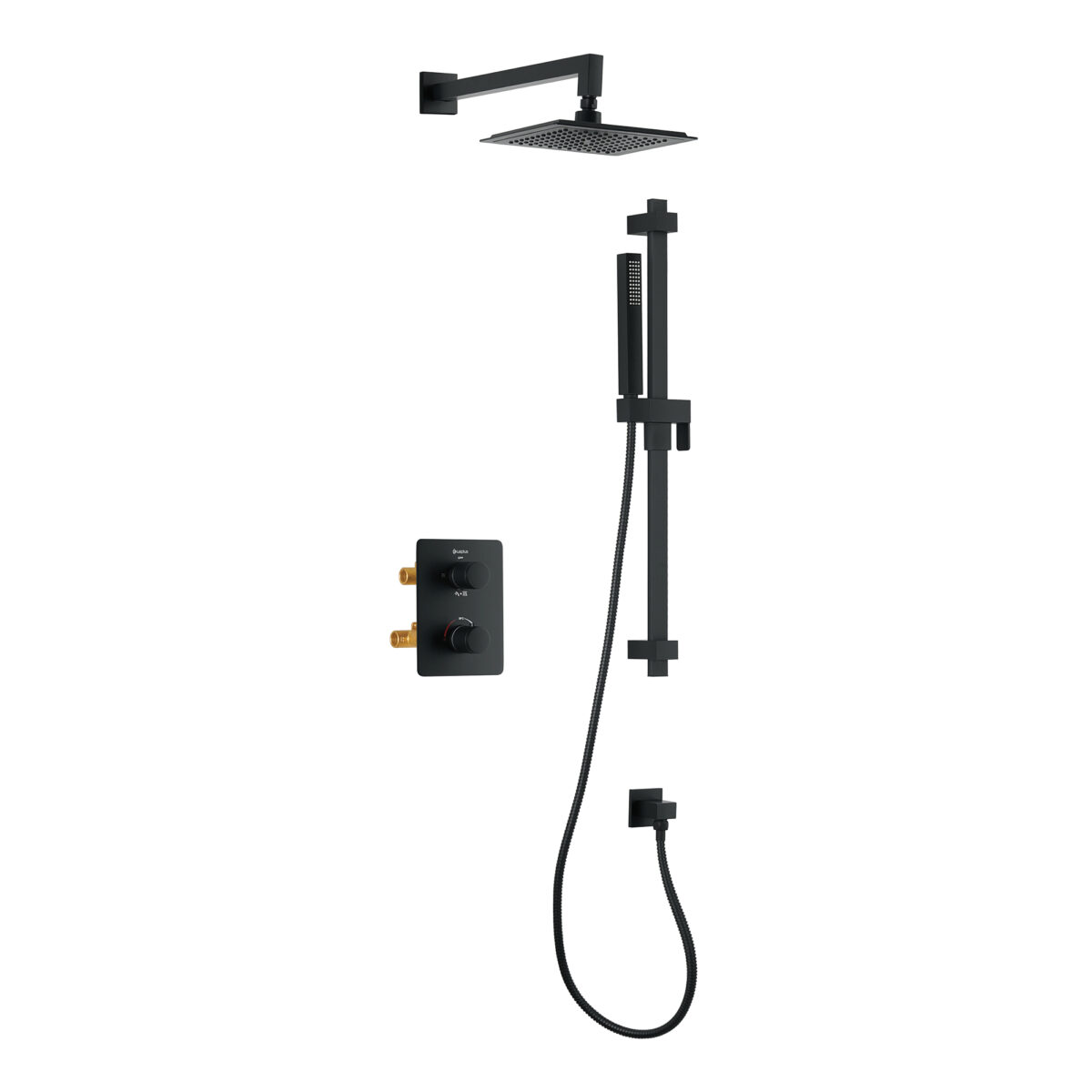 Square thermostatic Shower set with a 9-inch (22.86 cm) rain Showerhead and 1-setting handheld Shower in a matte black finish.