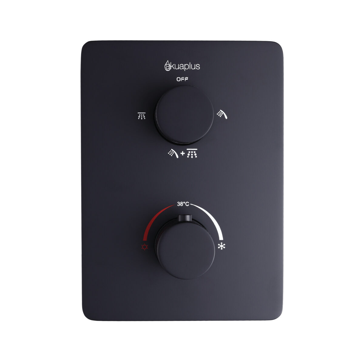 Square 4-way thermostatic shower set with waterfall shower head and hand shower on shower rail by akuaplus®