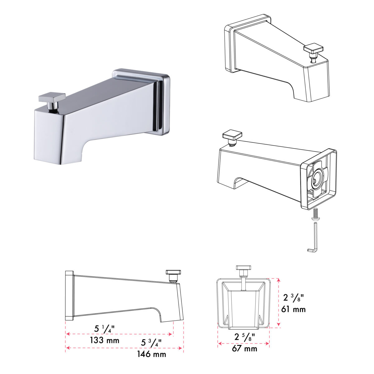 The akuaplus® square bathtub spout is made of durable zinc, providing strength and corrosion resistance. It features a 2-way diverter, allowing water to be directed either to the shower or to the tub spout as needed. Designed for slip-on installation, it fits a 1/2" (13 mm) copper pipe. The spout measures 5 3/4" (14.6 cm) in length, providing proper reach for standard residential installations. This product is cUPC certified, ensuring compliance with North American plumbing standards.