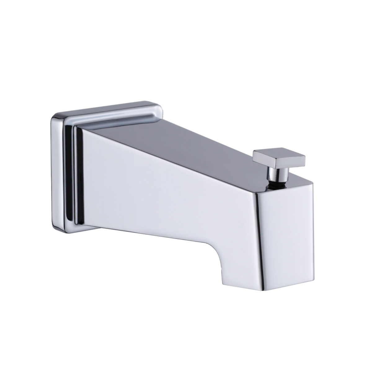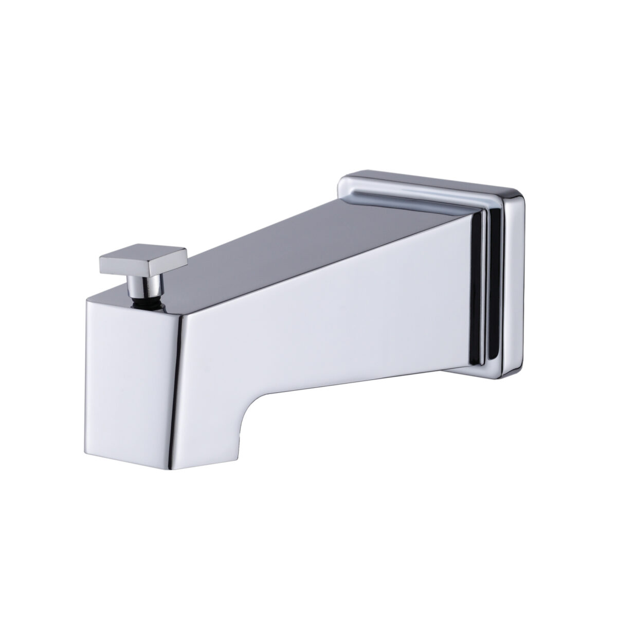 Square Bathtub spout with pull-up diverter in a chrome finish.