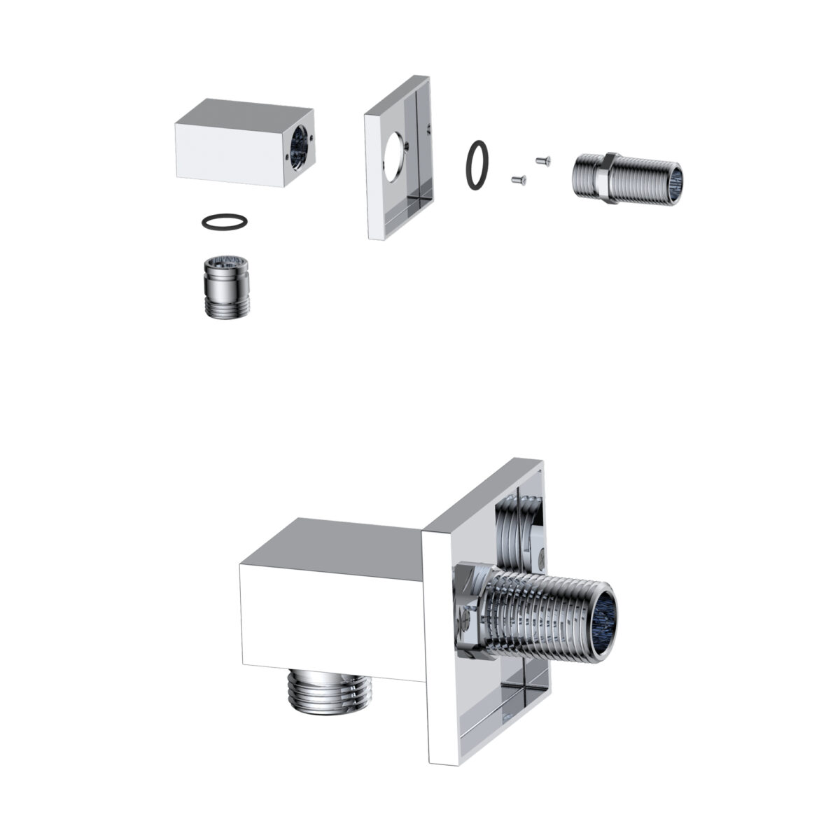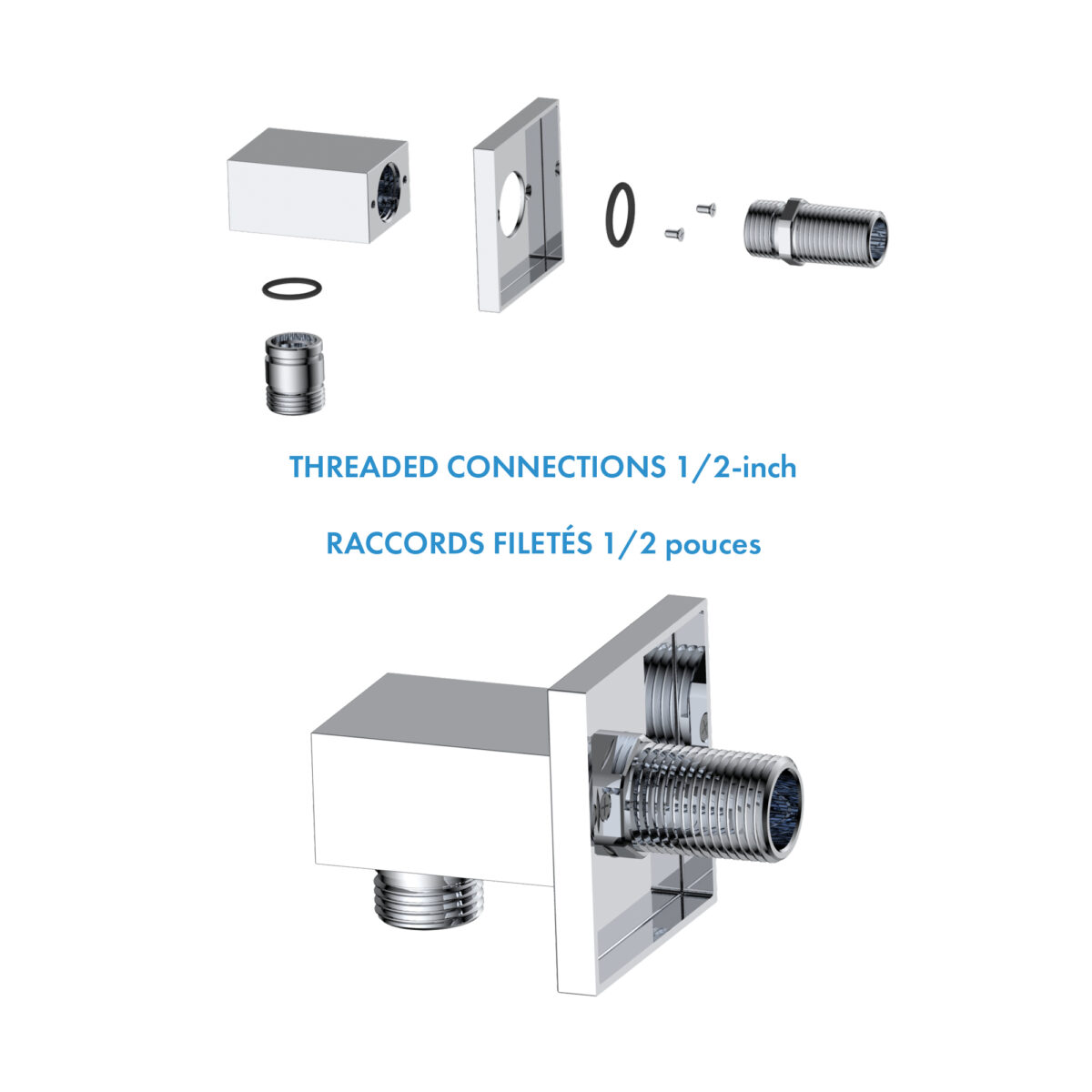 The akuaplus® square elbow fitting is made of durable brass, providing strength and corrosion resistance. Designed for residential plumbing applications, it features 1/2" NPT male × male threaded connections, ensuring secure, watertight installation and compatibility with North American plumbing standards. The square trim plate measures 2 3/8" × 2 3/8" (6 × 6 cm), delivering a clean, modern look and seamless integration into contemporary shower and bath systems. This product is cUPC certified, ensuring compliance with North American plumbing standards.