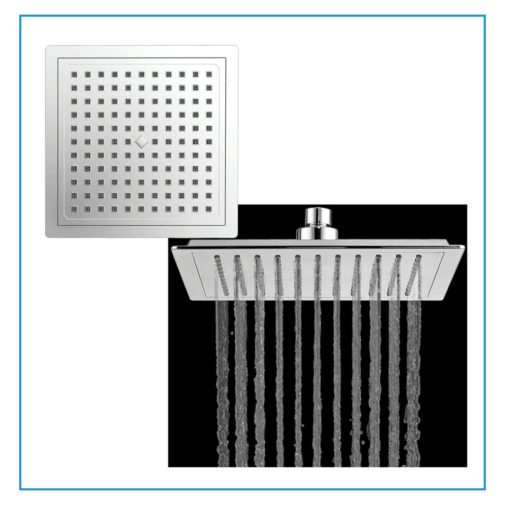 SQUARE SHOWER HEAD: Made of ABS; Swivelling; Brass ball joint; Easy-to-clean anti-limescale nozzles; 9 inches (22.86 cm); Flow rate of 9.5 L/min (2.5 US gal/min).