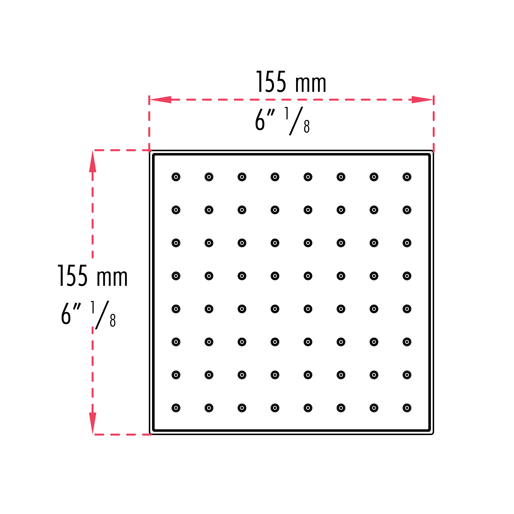SQUARE SHOWER HEAD: Made of ABS; Easy-to-clean anti-limescale nozzles; 6 inches (15.24 cm); Flow rate of 9.5 L/min (2.5 US gal/min).