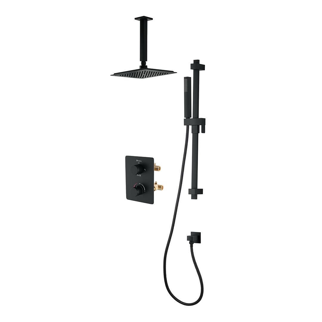 Square thermostatic Shower set with an 8-inch (20.3 cm) ceiling-mounted rain Showerhead and 1-setting handheld Shower in a matte black finish.