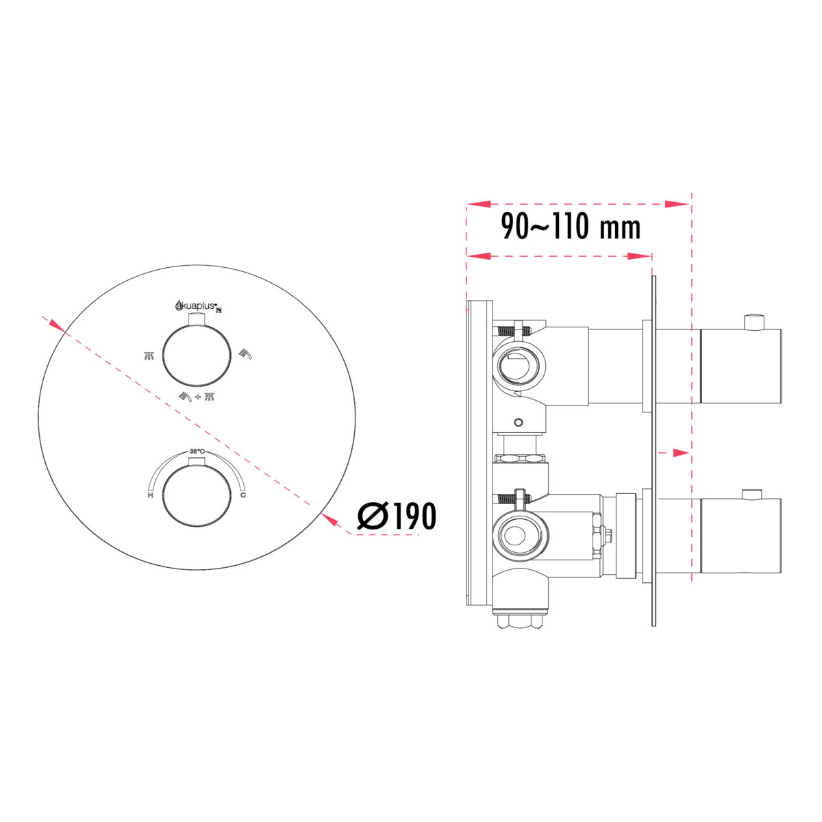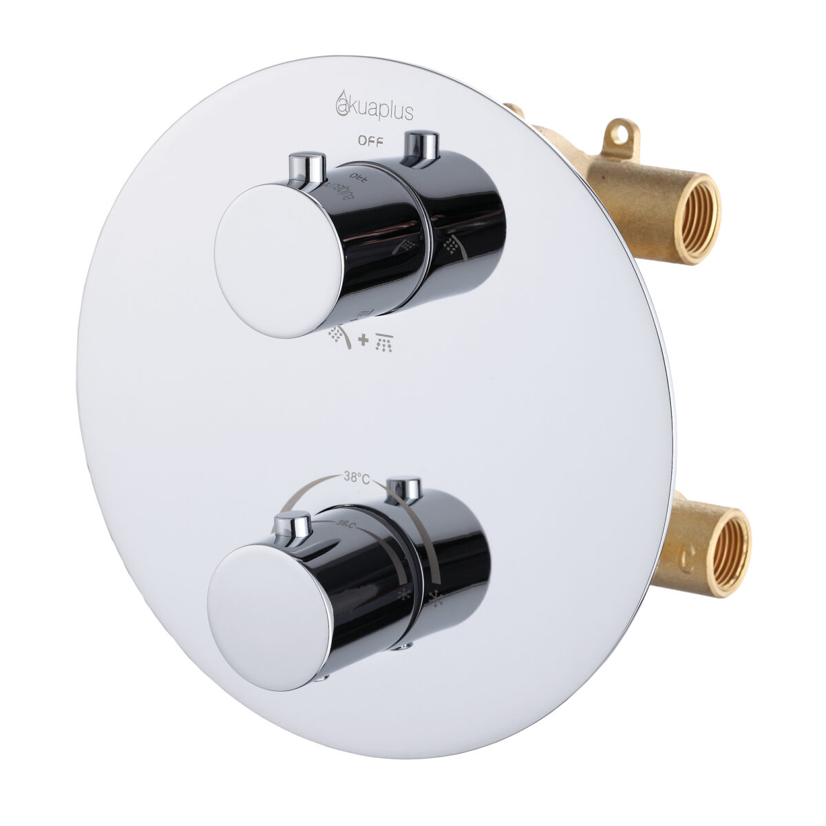 The TALI round thermostatic shower valve by akuaplus® is constructed from solid brass and designed to deliver precision, safety, and versatility for modern residential installations. It features two separate control handles: one thermostatic handle for precise and safe temperature control, and one 4-way diverter handle allowing selection of one outlet, another outlet, both simultaneously, or the off position. An integrated stop valve facilitates servicing and maintenance. The valve includes 1/2" threaded female connections, compatible with North American plumbing standards. The round trim plate has a diameter of 7 1/2" (19 cm), providing a clean and contemporary wall finish. This valve is cUPC certified, ensuring compliance with applicable plumbing standards.