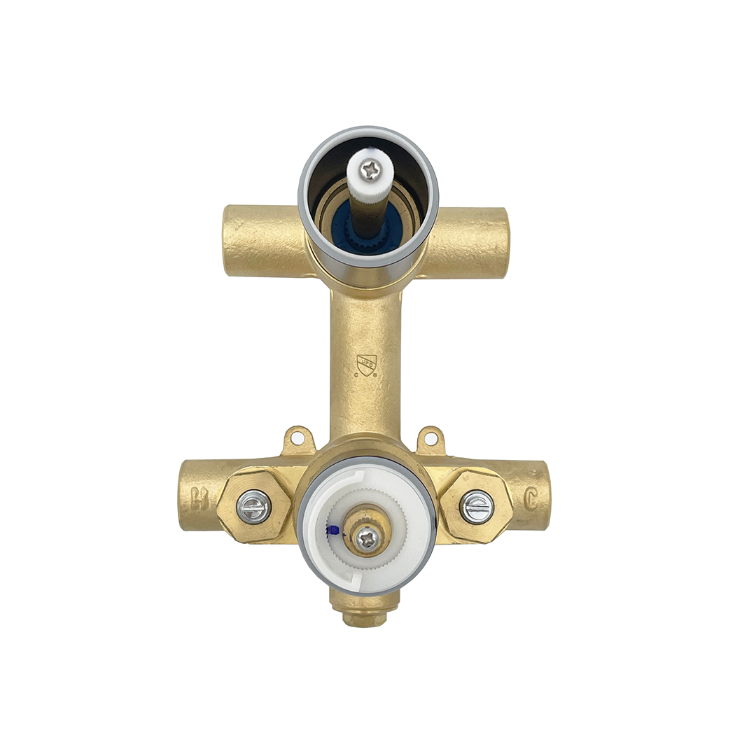 THERMOSTATIC SHOWER VALVE: Made of brass; 4-way diverter (the one, the other, both simultaneously or off); Thermostatic cartridge, Round cover plate and knobs.