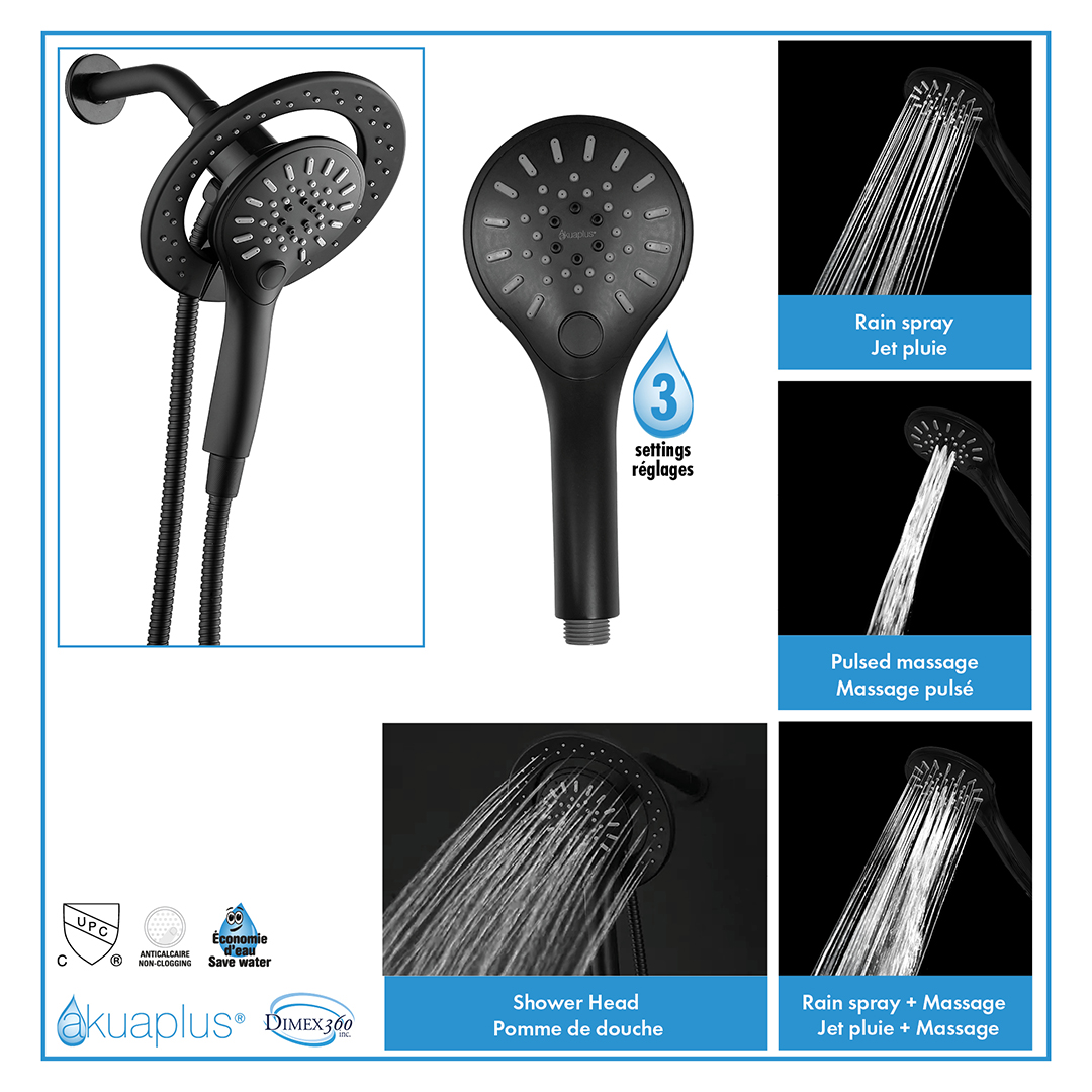 The set includes a 3-setting push-button magnetic handheld shower, activating a 7 3/8-inch (18.7 cm) pivoting shower head equipped with anti-limescale nozzles for easy maintenance. The robust 6-inch (15.24 cm) brass wall-mounted shower arms and flexible 59-inch (1.5 m) double interlocking stainless steel hoses with brass fittings add durability and style.