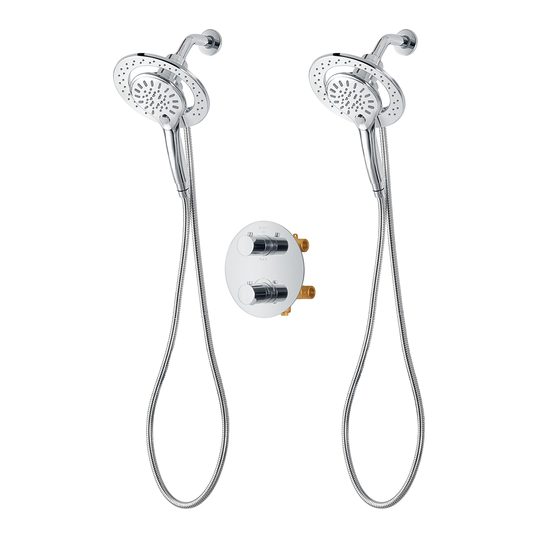 MAGNETIC THERMOSTATIC SHOWER SET: Valve made of brass with thermostatic cartridge; 4-way diverter (shower system, other shower system, both simultaneously or off); Shower systems with 3-setting push-button magnetic ABS handheld showers that activate the 7 3/8 inch (18,7 cm) pivoting ABS shower heads with easy-to-clean anti-limescale nozzles; 6-inch (15.24 cm) brass wall mount shower arms; Flexible and extendable 59-inch (1.5 m) double interlocking stainless steel hoses with brass fittings; Flow rate of 9.5 L/min (2.5 US gal/min).