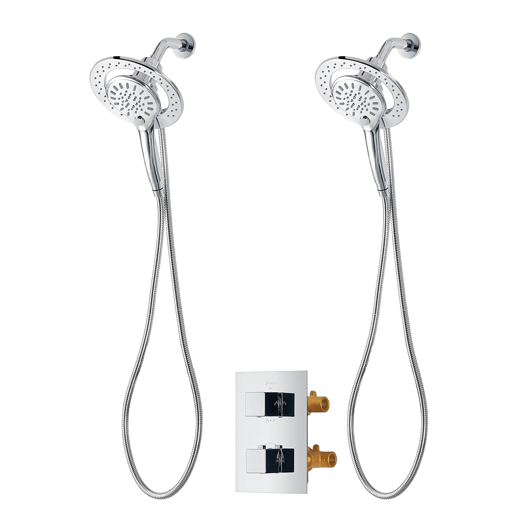 MAGNETIC THERMOSTATIC SHOWER SET: Valve made of brass with thermostatic cartridge; 4-way diverter (shower system, other shower system, both simultaneously or off); Shower systems with 3-setting push-button magnetic ABS handheld showers that activate the 7 3/8 inch (18,7 cm) pivoting ABS shower heads with easy-to-clean anti-limescale nozzles; 6-inch (15.24 cm) brass wall mount shower arms; Flexible and extendable 59-inch (1.5 m) double interlocking stainless steel hoses with brass fittings; Flow rate of 9.5 L/min (2.5 US gal/min).
