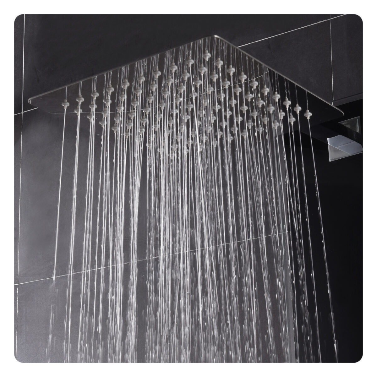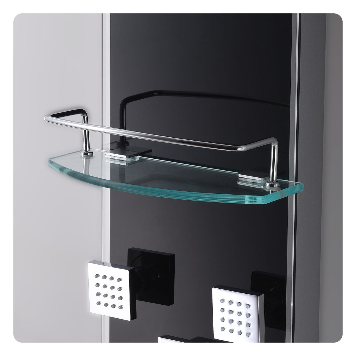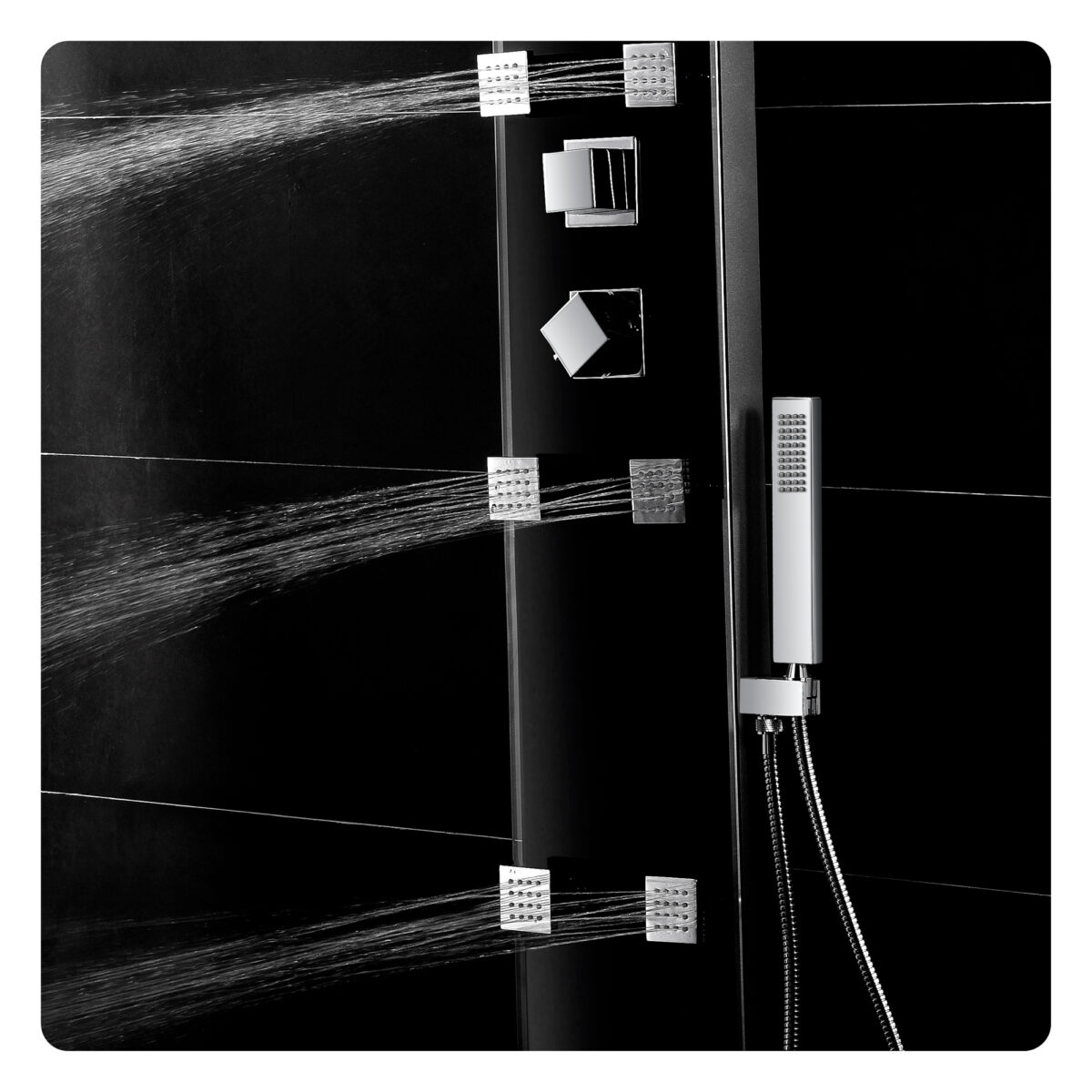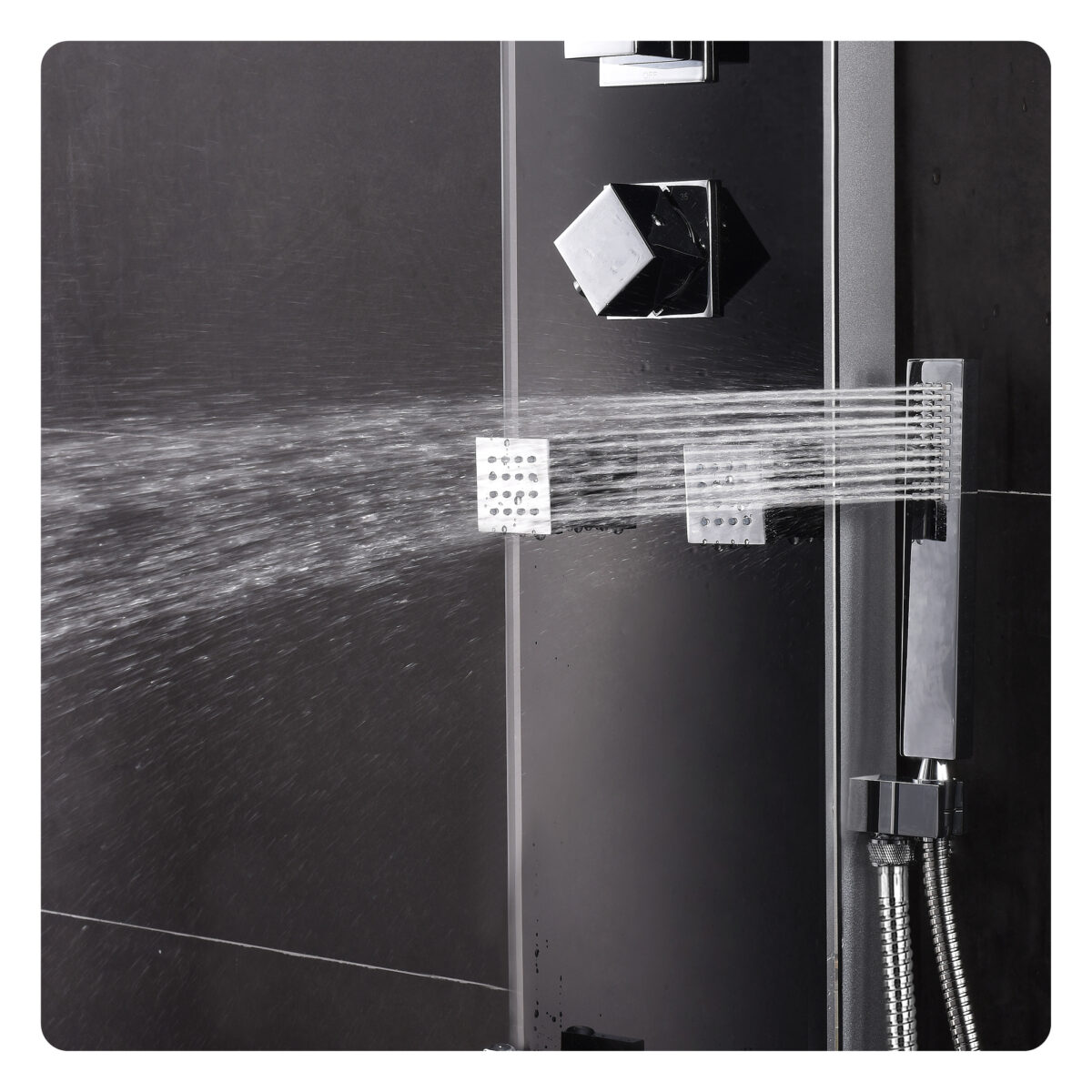 The ZARA thermostatic shower panel by akuaplus® is designed to deliver a complete and refined shower experience for modern residential bathrooms. Constructed from aluminum with a 6 mm tempered glass front panel, it combines durability with contemporary styling. The thermostatic cartridge maintains consistent and safe water temperature, while the 4-way diverter allows operation of the waterfall showerhead, hand shower, body jets, or a combination of functions depending on user preference. The 9 3/4" (24.7 cm) square stainless steel showerhead swivels on a brass shower arm to provide wide waterfall coverage. The 1-setting hand shower with brass holder and the six swivelling brass body jets enhance comfort and versatility. Easy-to-clean anti-limescale nozzles simplify maintenance. An integrated tempered glass shelf offers convenient storage for shower essentials. The panel includes a 59" (1.5 m) double interlocking stainless steel flexible hose with brass fittings, as well as braided stainless steel supply hoses with elbow fittings for water connection. The flow rate is limited to 9.5 L/min (2.5 US gal/min). This shower panel is cUPC certified, ensuring compliance with North American plumbing standards.
