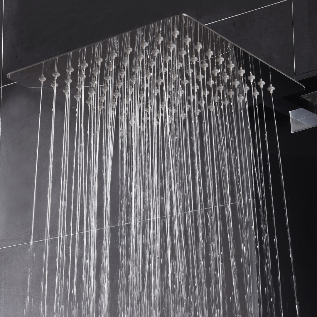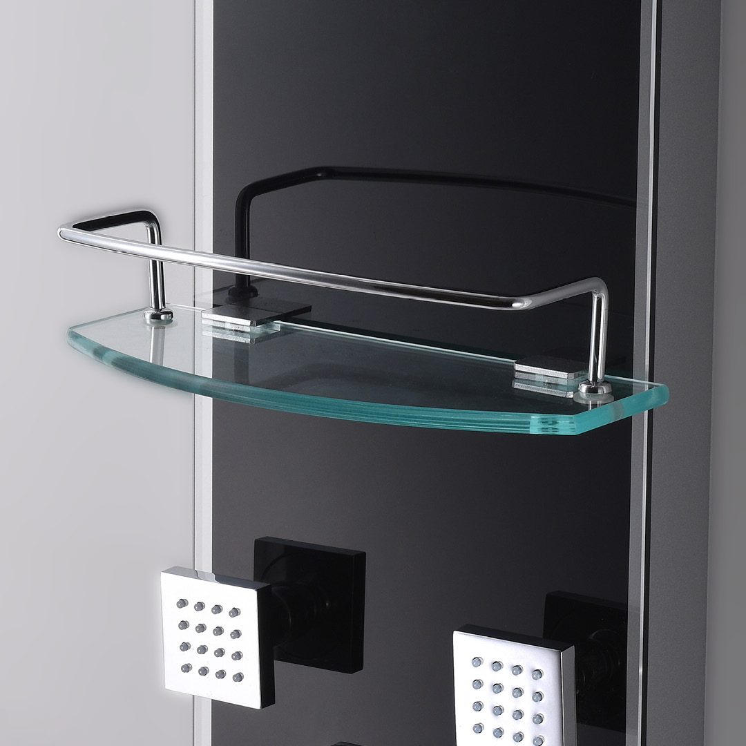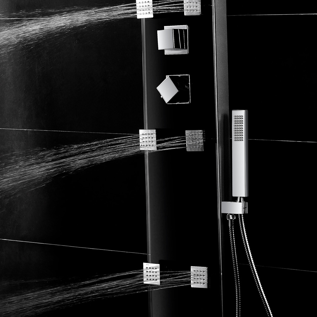 THERMOSTATIC SHOWER PANEL: Made of aluminum; 6 mm tempered glass in a black finish; Thermostatic cartridge; 4-way diverter; Shower arm made of brass; Square 9-3/4-inch (24.7 cm) made of stainless steel; 1-setting handheld shower made of brass; 6 swivelling body jets made of brass; Easy-to-clean anti-limescale nozzles; Brass handheld shower bracket; Glass tempered shelf; Flexible and extendable 59-inch (1.5 m) double interlocking stainless steel hose with brass fittings; Flexible braided stainless steel supply hoses with elbow fittings; Flow rate of 9.5 L/min (2.5 US gal/min).